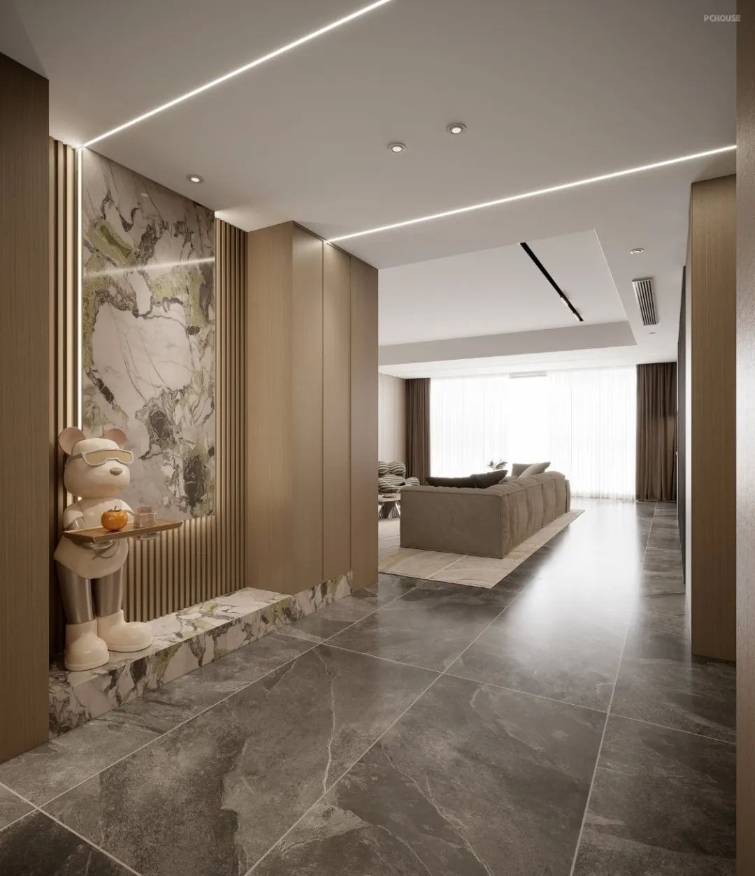 ❶原始的地面是木地板,顶面是回型吊顶,全部进行了拆除,重做现代无主灯设计,1.5mx75cm瓷砖通铺。