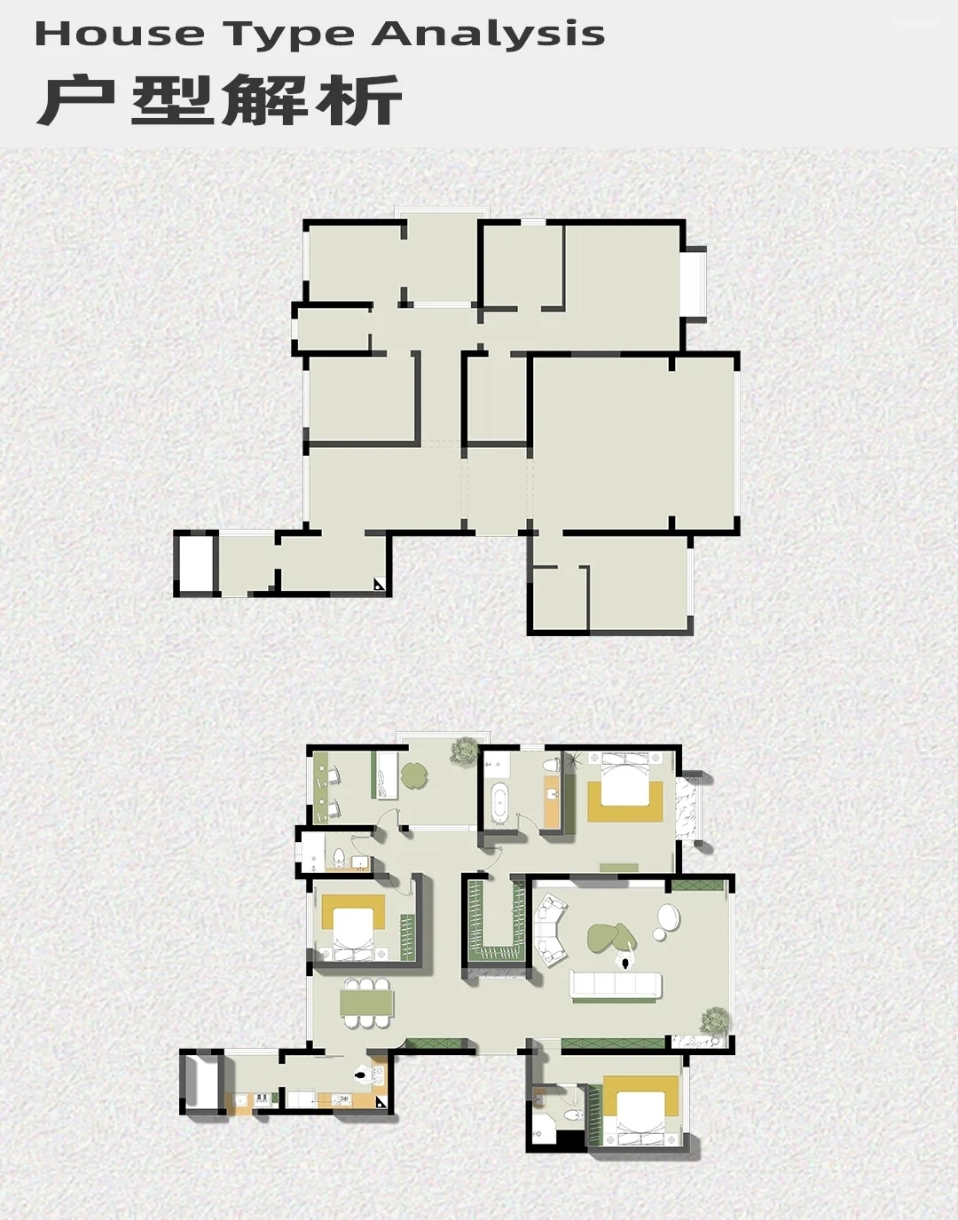 ●原始户型是五室三厅三卫精装房,原始装修颜色过于沉重,沉闷。