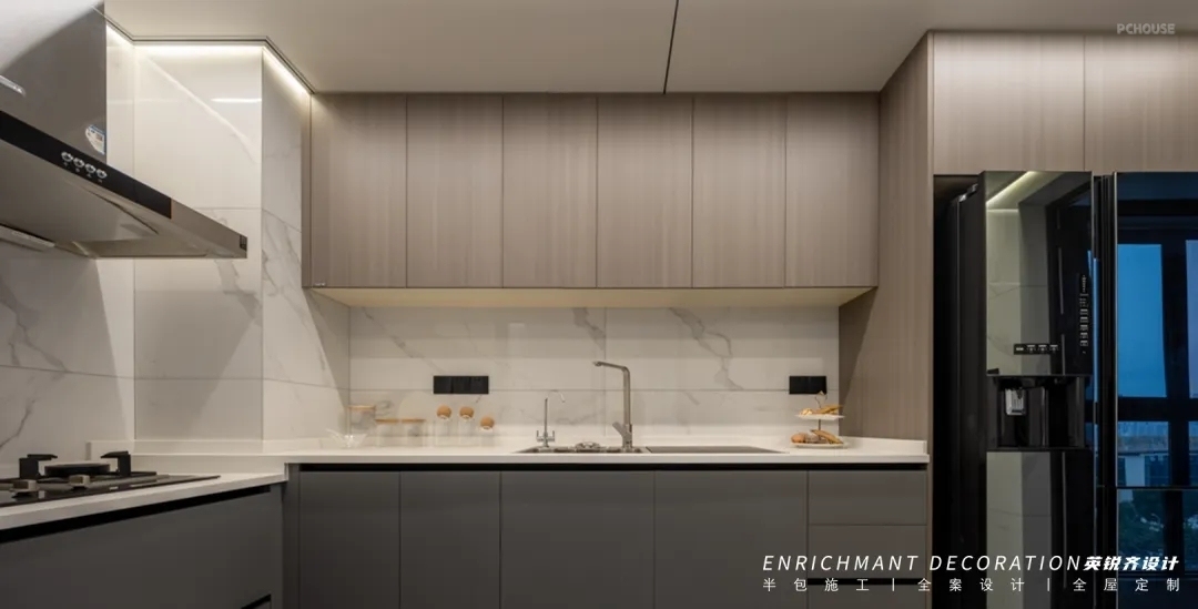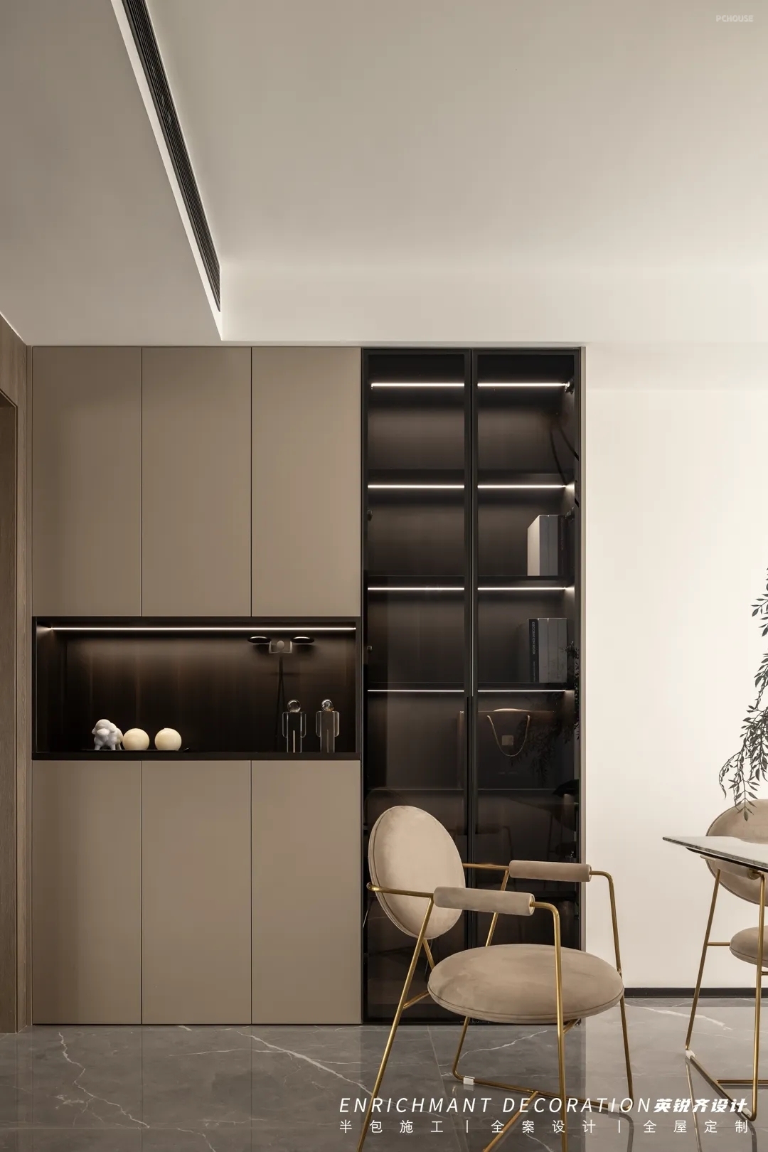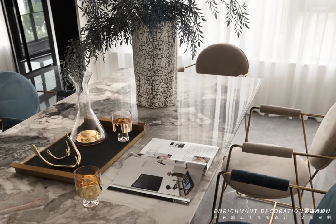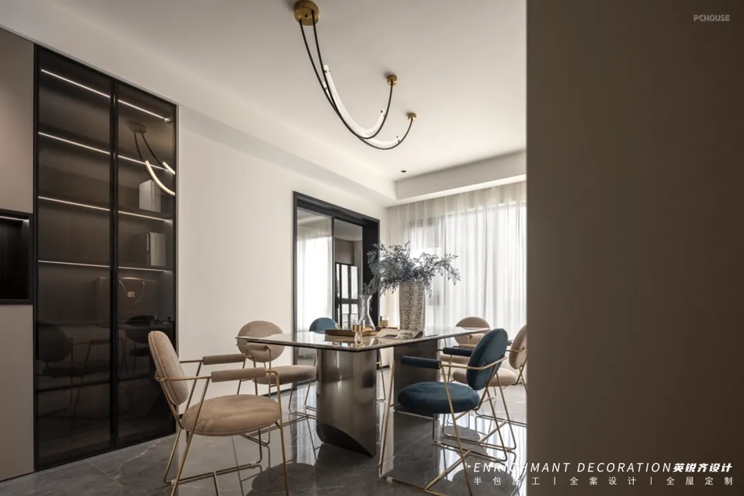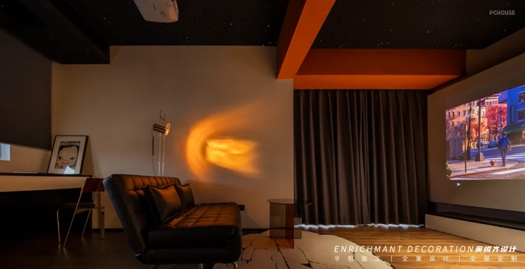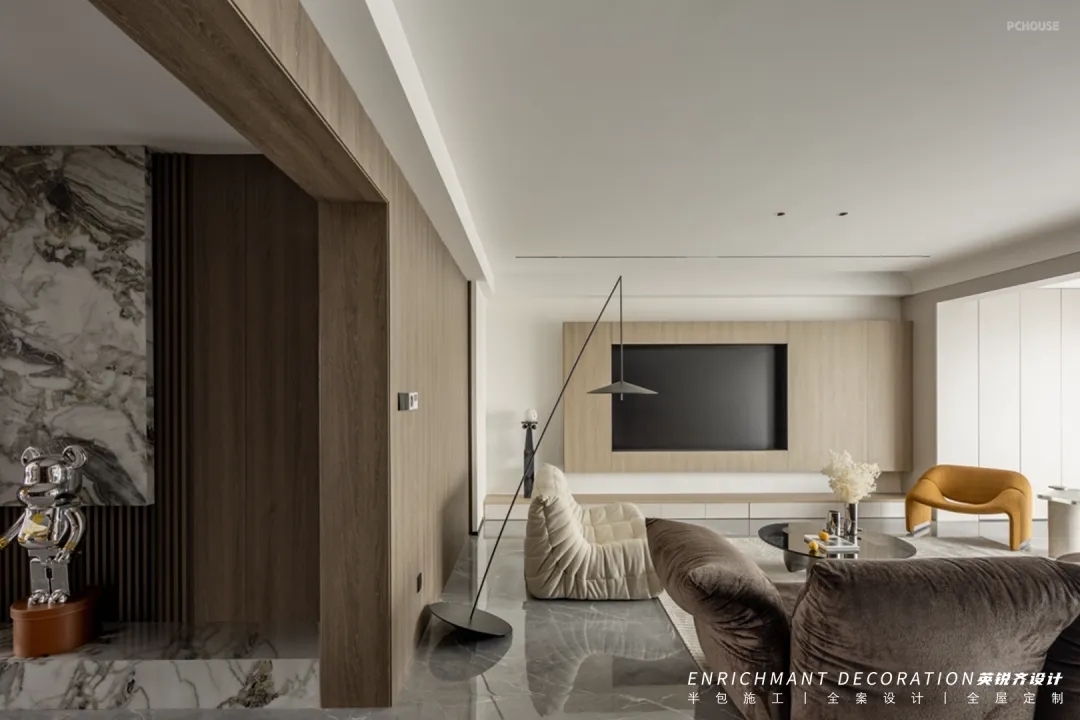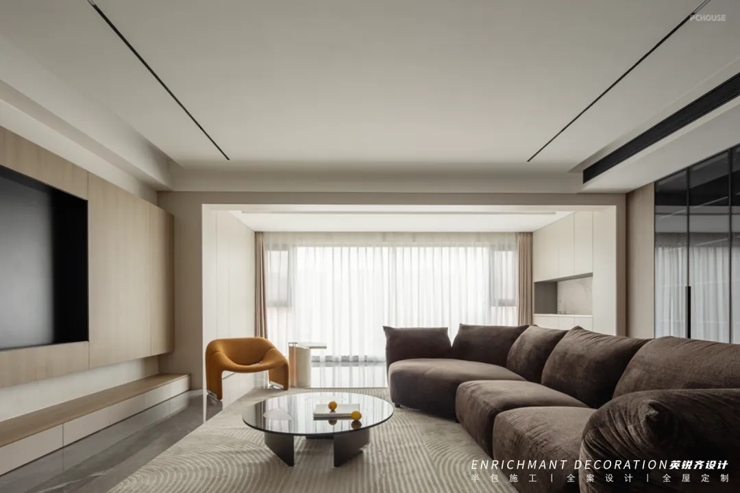 ❷客厅改造总面积50m²,原始阳台是外扩的,没有封进来拆掉了推拉门,让将近20m的阳台融入了客厅,同时做了一个落地式的封窗设计,视野更开阔,采光更好。