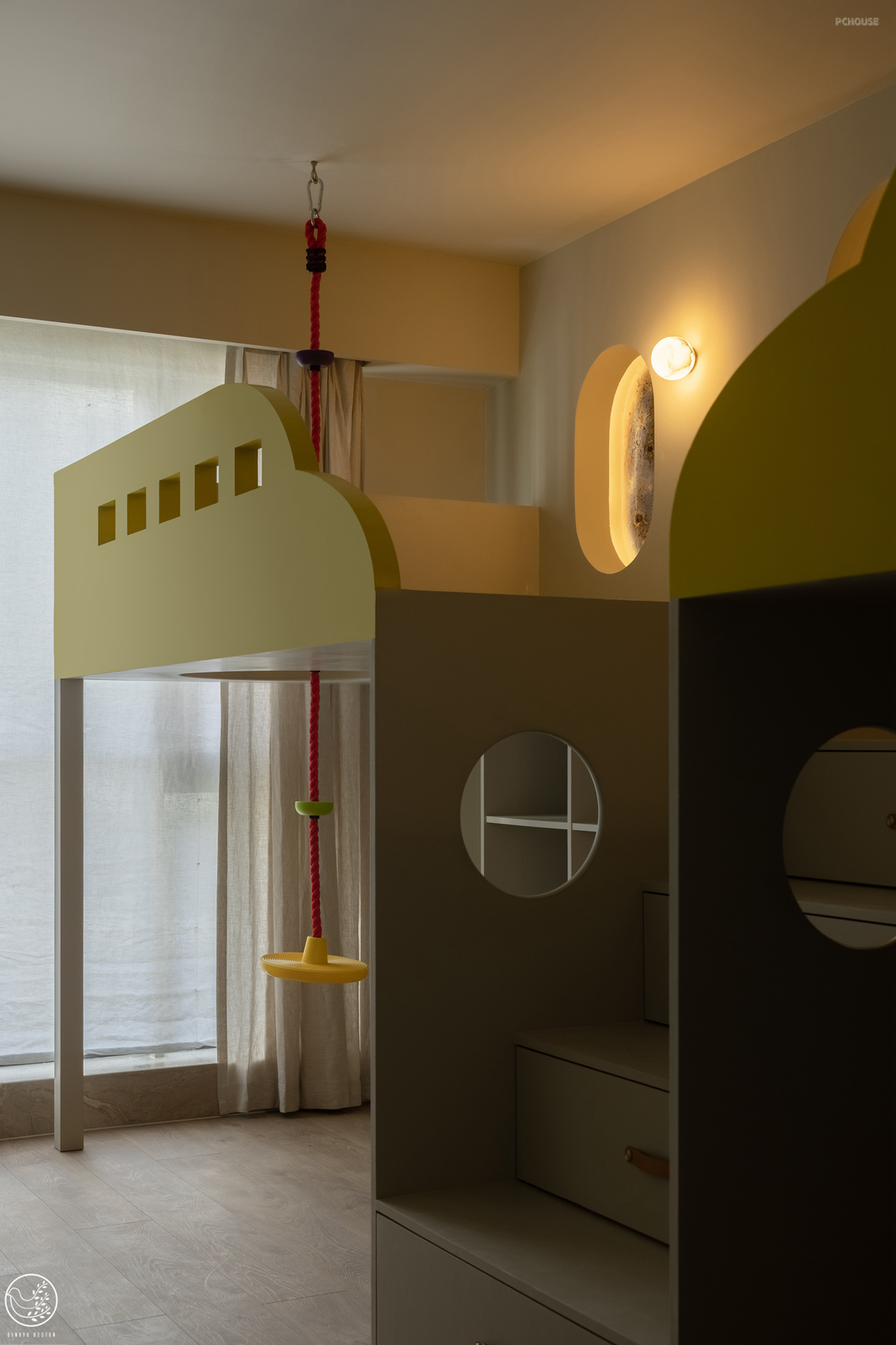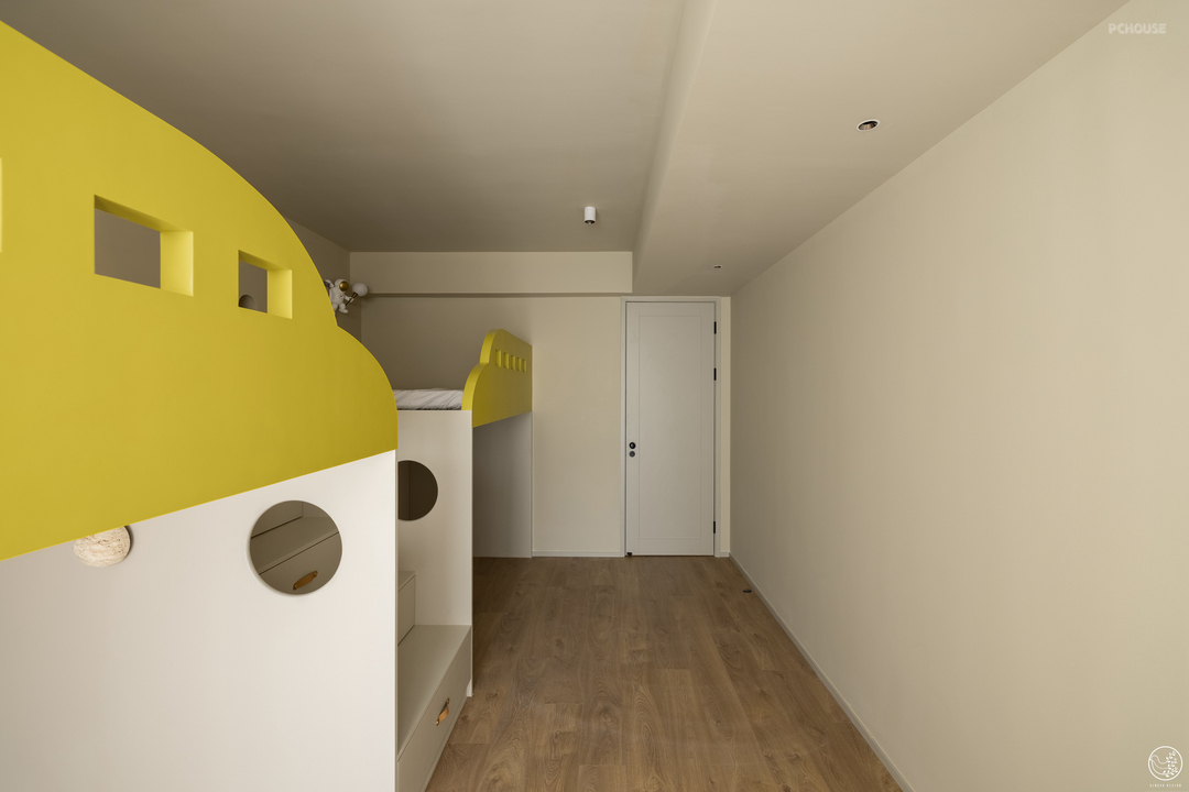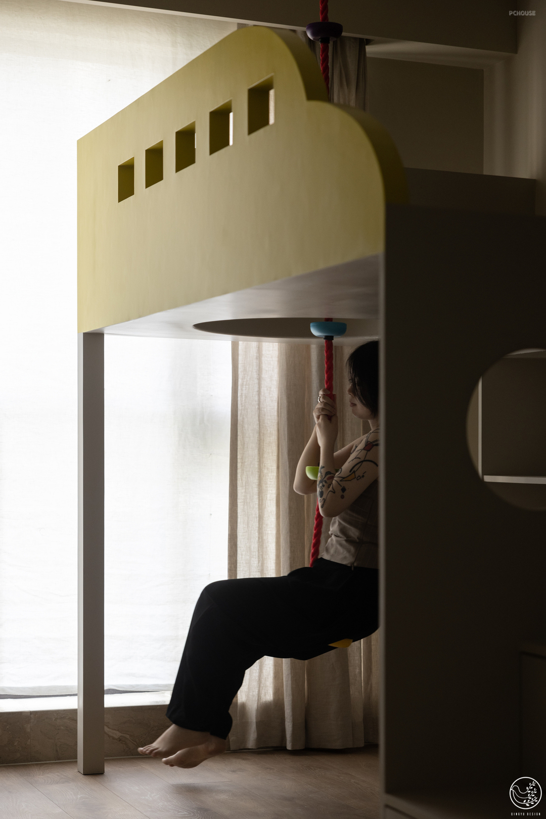房子原本的户型就很好,尺度感也大。对一家三口来说,上下两层的复式加上屋顶花园,足够开阔,可以玩的很“任性”。所以设计师宋夏设计的时候,更多地考虑在完善功能的需求之上,这个空间的“有趣”: