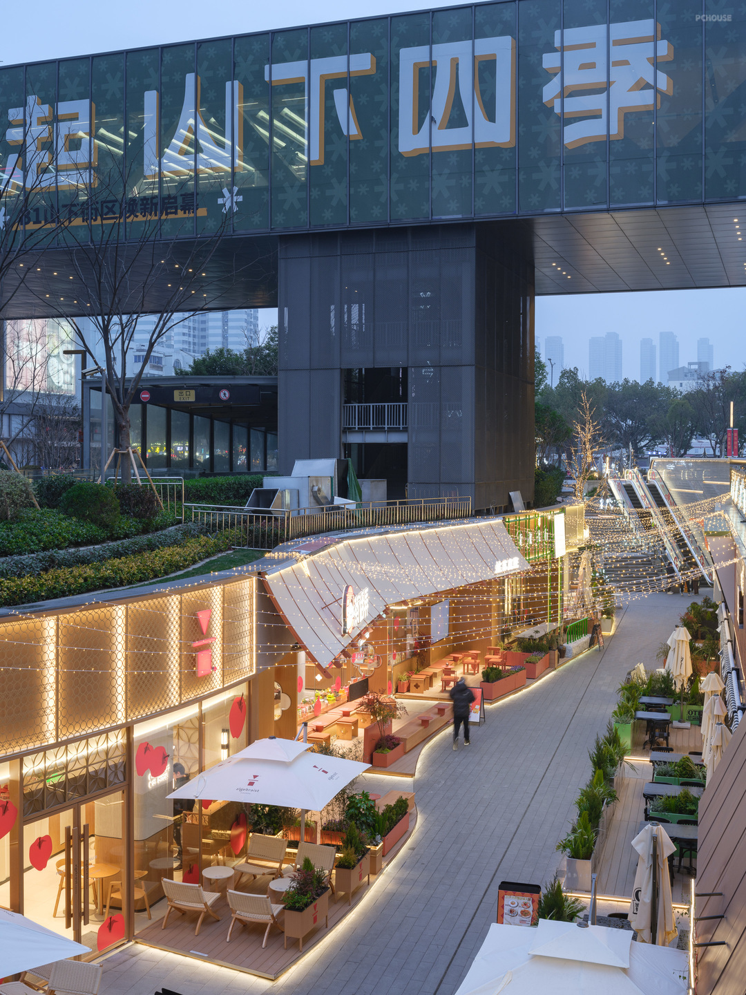 设计师申俊伟灵感源自「山下派对」,构想出取景山下、社交山下、趣味山下的自然状态,依托室内、外两大功能区,设定核心场景递进式变化体验,以环形游逛动线将室内大街、小巷、店铺、休闲区、庭院五大元素串联,并于外街连通,宛如正在进行一场欢快的山下派对。