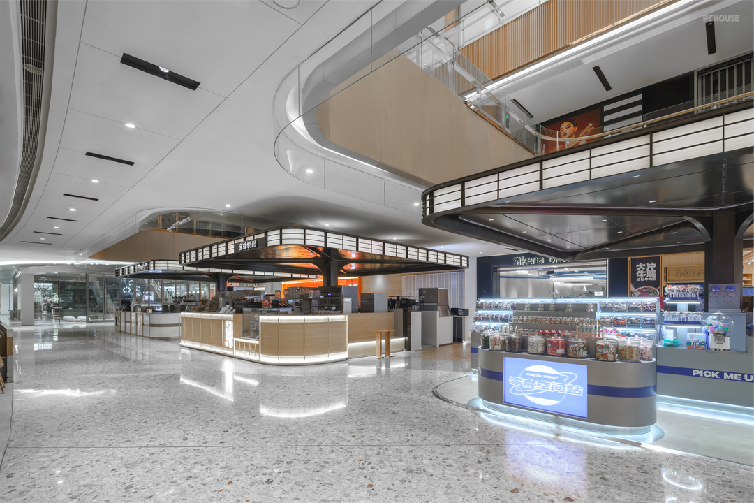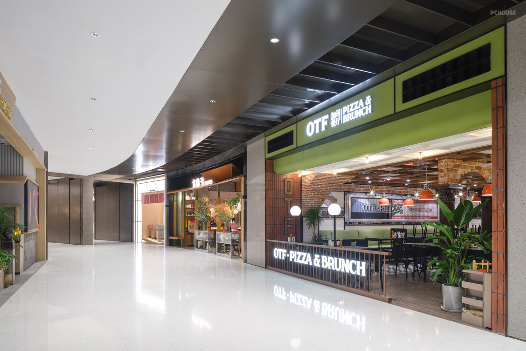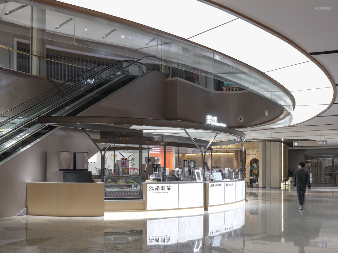 进入室内美食街,犹如踏着石板路走进蜿蜒的山林之间,古铜色铝板的透空叶片的天花板,形成高低错落的层次,隐藏在叶片缝隙间的光洒下斑斓的光影,衬托出两侧的店铺亲近而温馨,游逛在光影的交织和食物的香味之中,人与“山林”相映,每一步前行都是迎面徐徐展开的自然画卷。