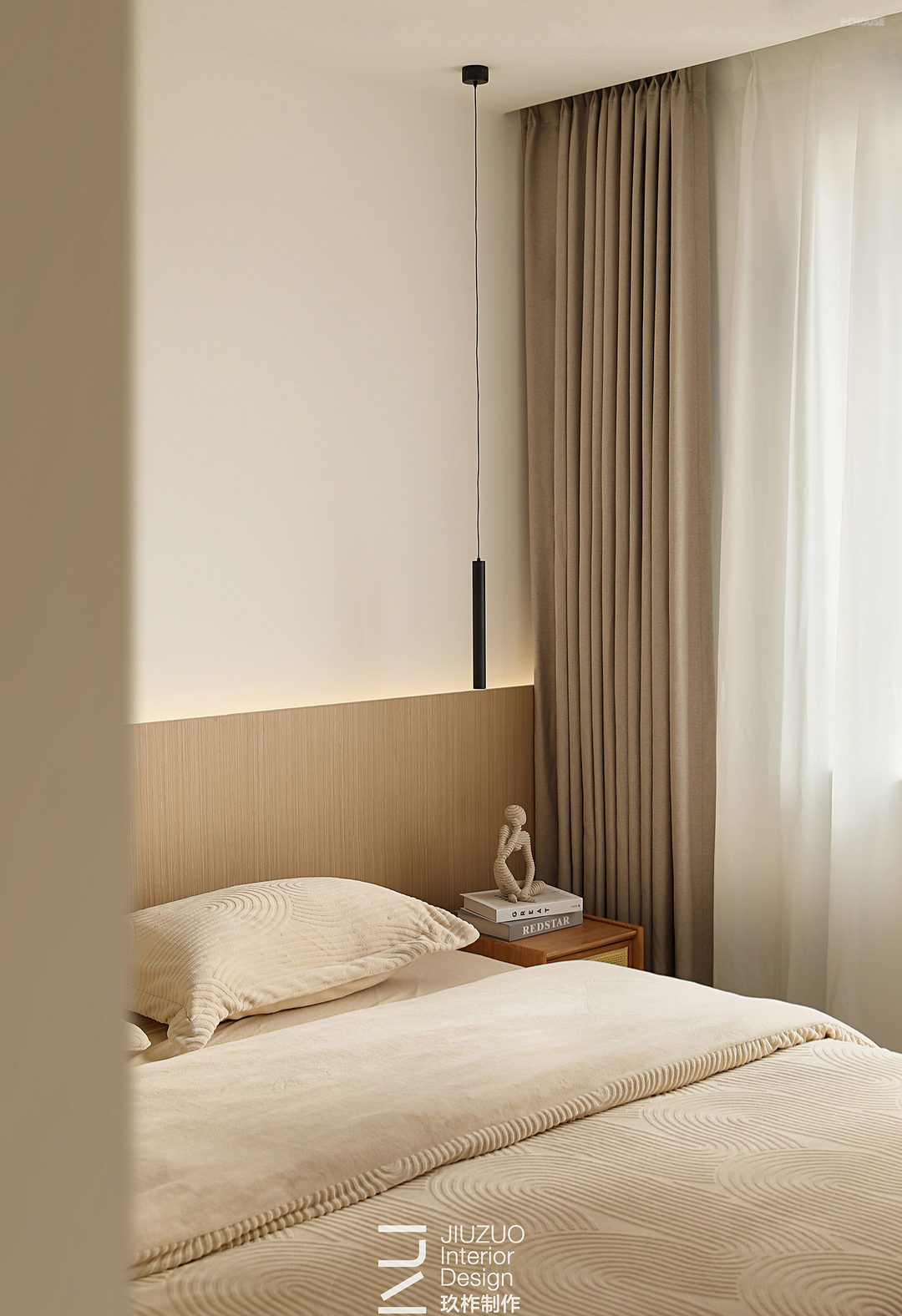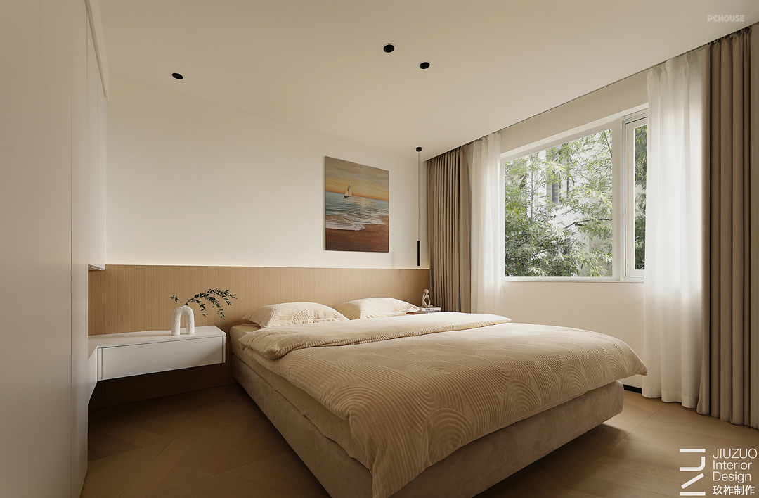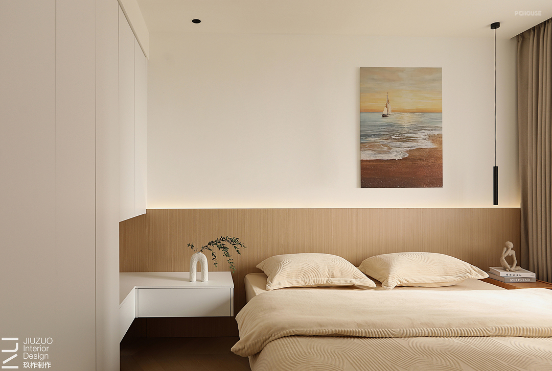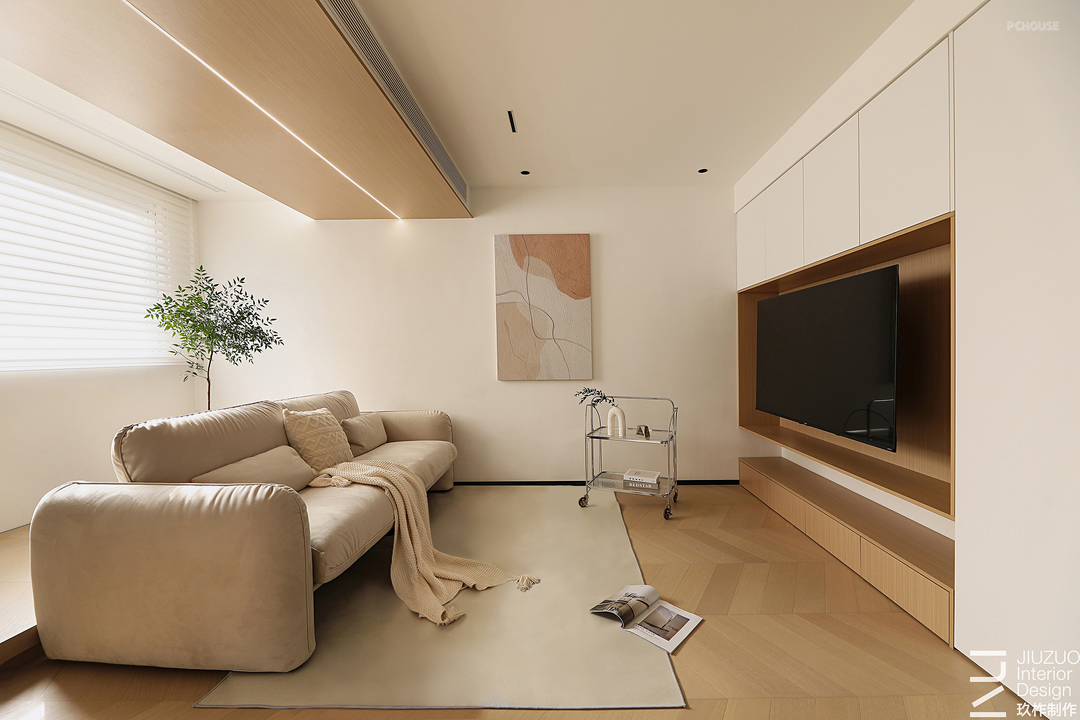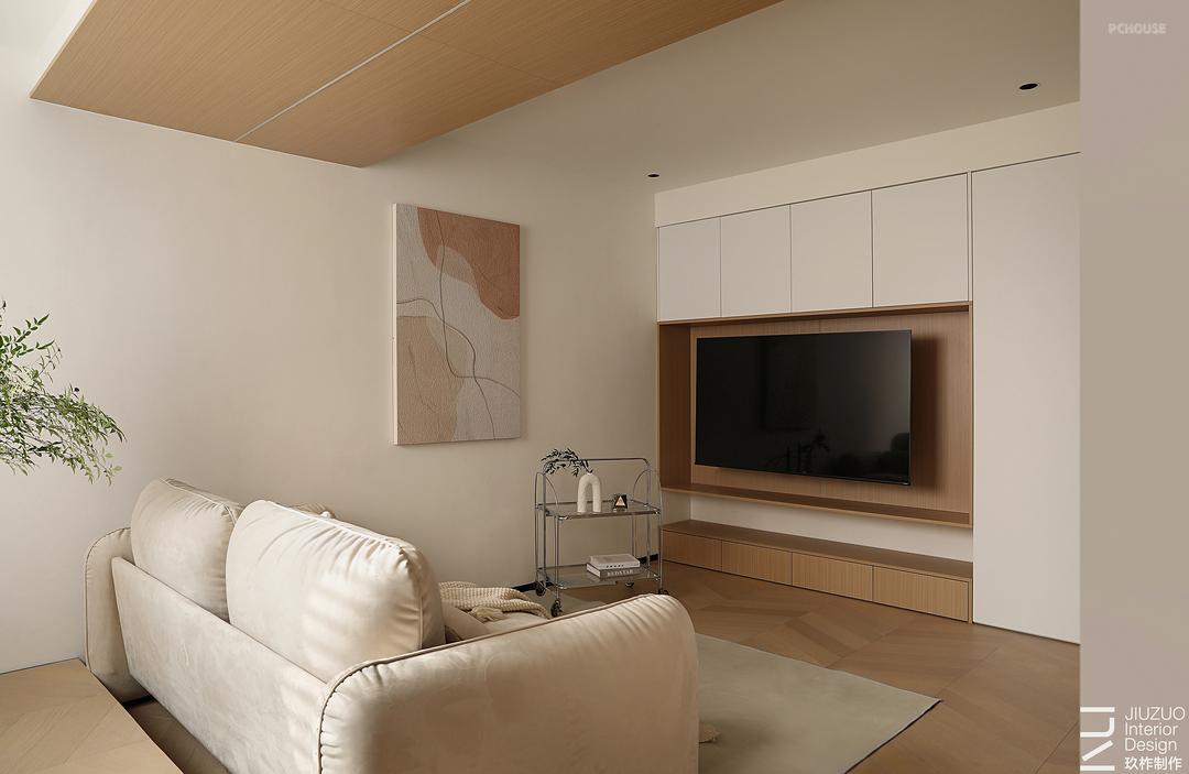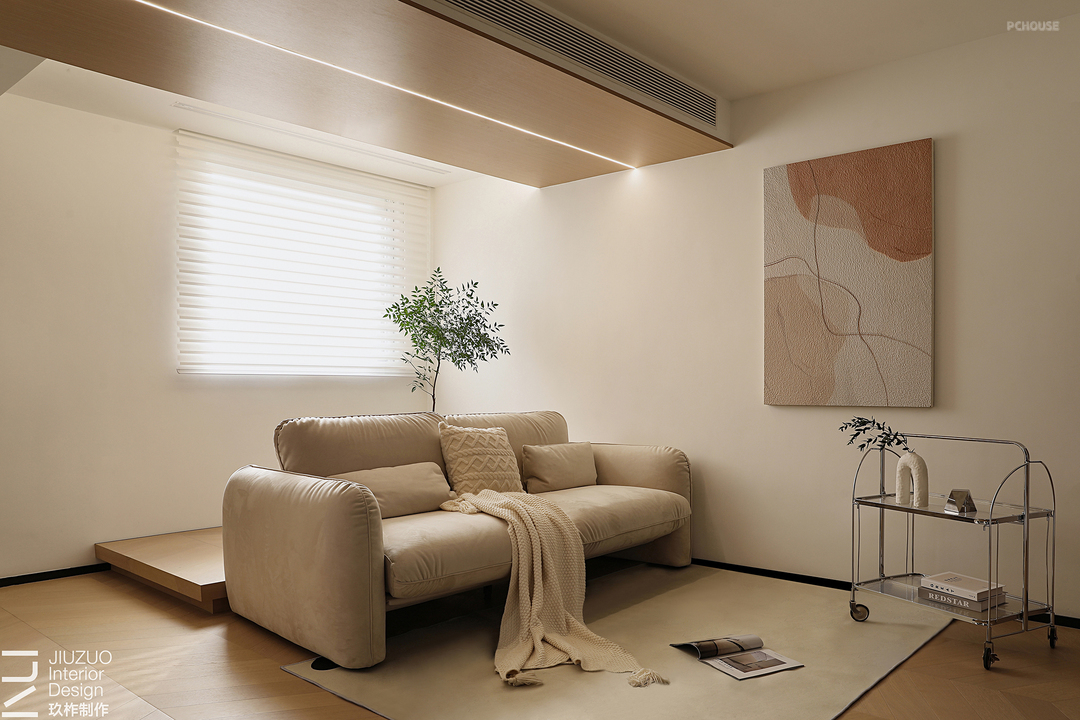 设计赋予住宅温柔的奶油色调,天花板和地面覆盖着温润的木质,光影下,自然的纹理质感与暖白色形成呼应,搭配同色系的布艺家具,让整个空间更有温度。