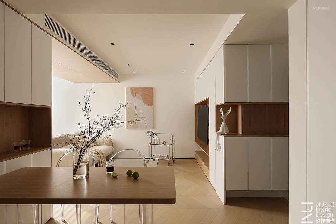 电视墙与玄关延伸而来的收纳系统相结合,木与白清新淡雅,将生活的琐碎无形收纳,留下生活里的热热闹闹。