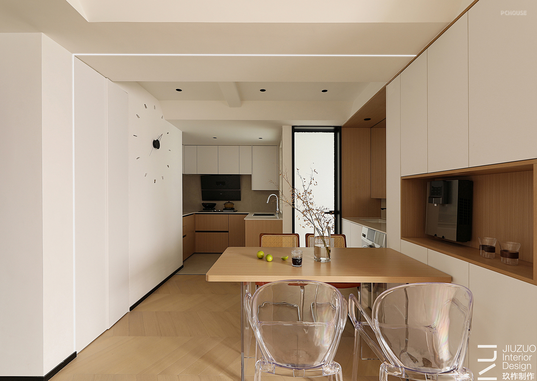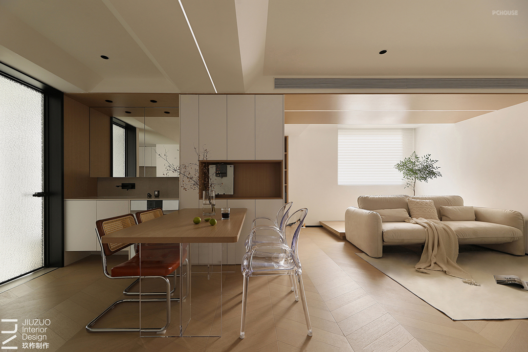 整体公区空间的灵感来自清淡平和,运用了包容的暖白、木质等自然材质,以关照生活体验为初心,拆除厨房墙体,将客餐厨的生活场景互动链接,打造出舒适简约且极具生活感的居住空间。