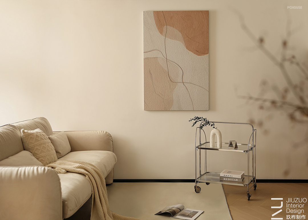 无论是形式上亦或是功能上,沙发作为客厅的核心,都有着简约、舒适、无阻的内核表达,与简约置物架和悬挂壁画一起,共同勾勒出一派岁月静好。