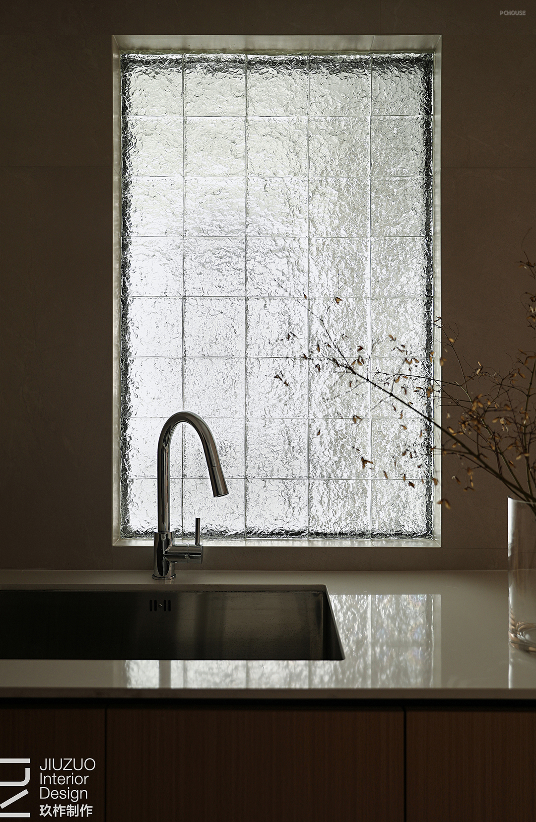 利用厨房的位置特点,洗手间墙面以玻璃砖作为艺术呈现,引一束光入室,透光不透人,提升空间明亮度。一方朦胧光影流动,营造灵动惊艳瞬间。