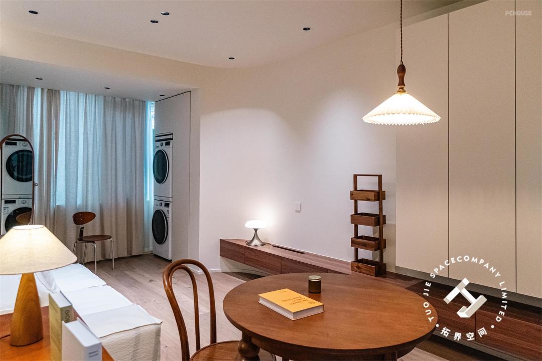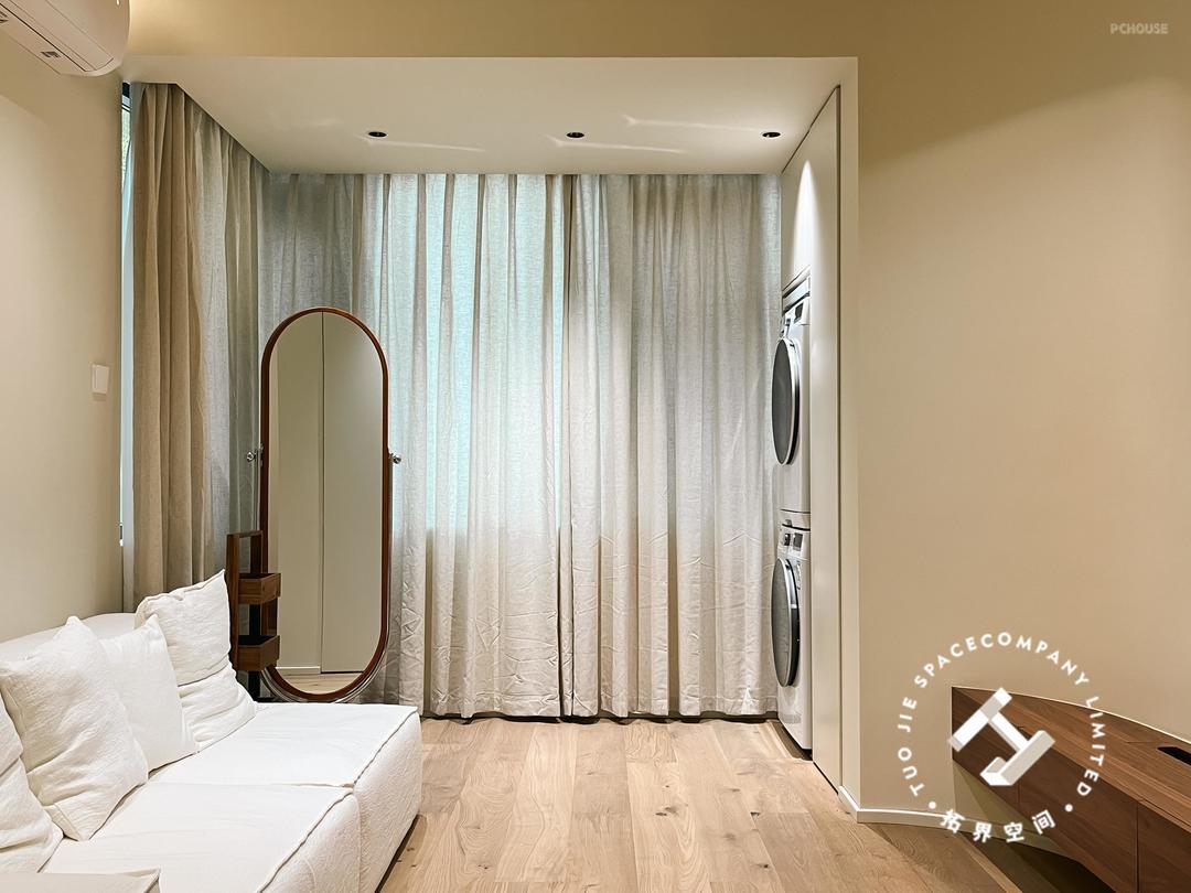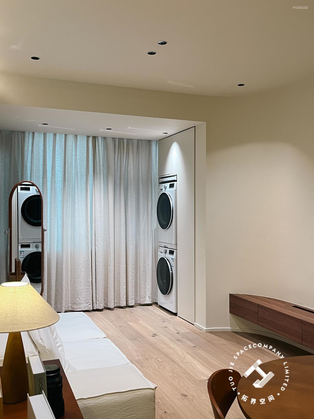客厅与阳台结合在一起,定制洗衣柜与墙垛平齐,白色的柜体和洗衣机烘干机,浑然天成,视觉上和谐统一,整体性更强。