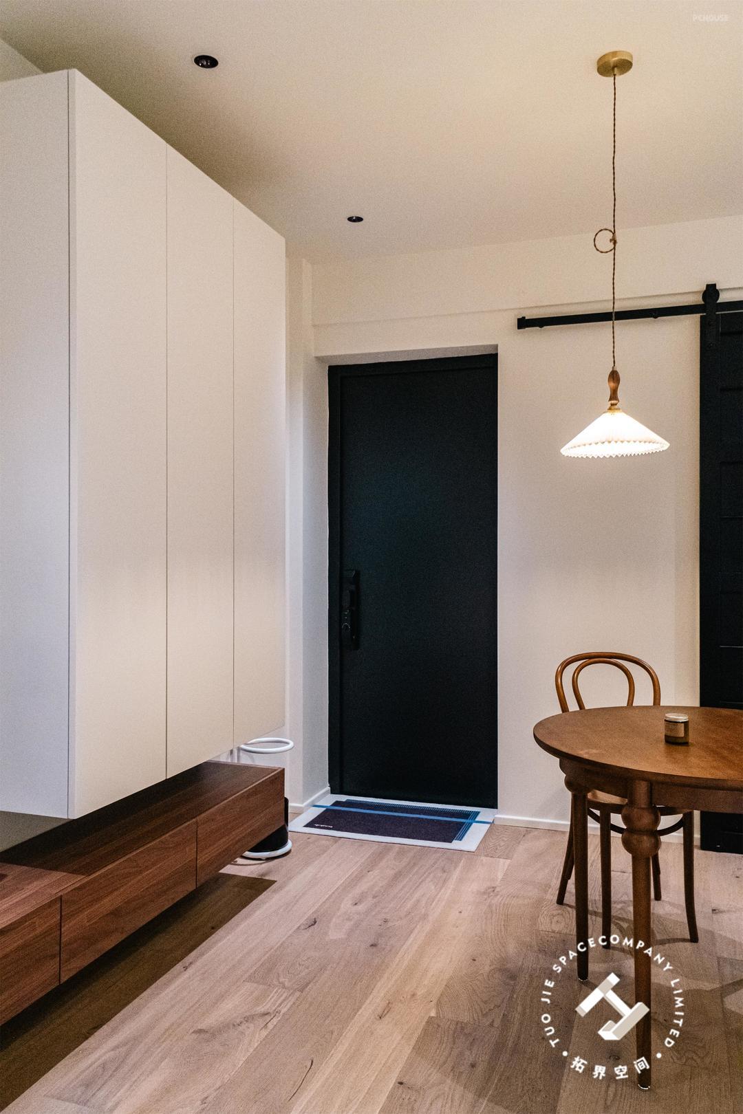 两个悬空的柜体交叠在一起,塑造了一个倍感轻松的过渡空间;用一个小巧的黑白色伞桶作为点缀,让玄关区域瞬间个性鲜明起来。