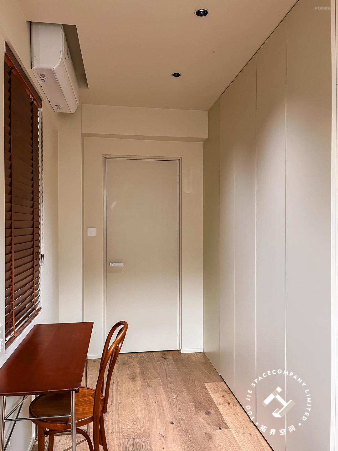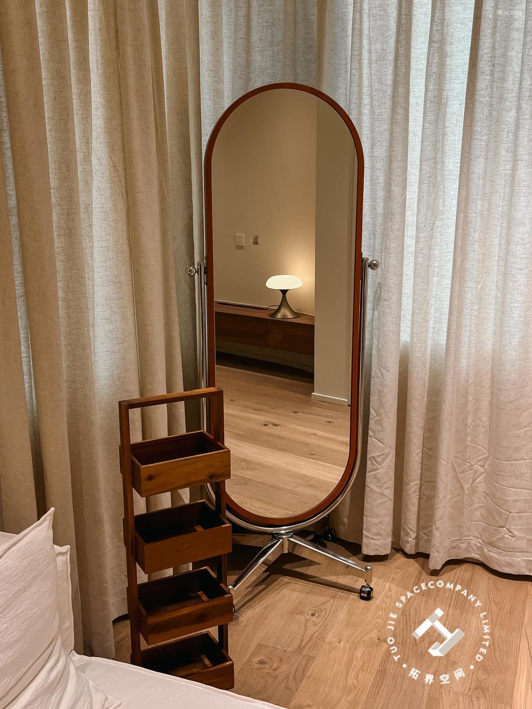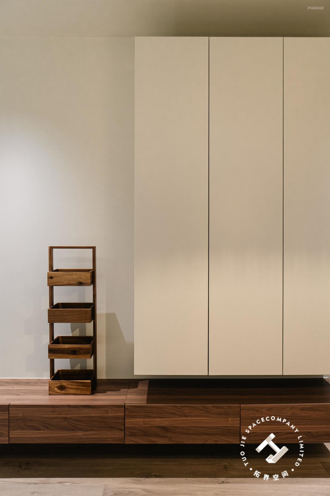 入门处至床头处定制衣柜+床头柜的组合柜,靠近床头的侧边镂空做床头柜,充分利用空间满足卧室的功能。