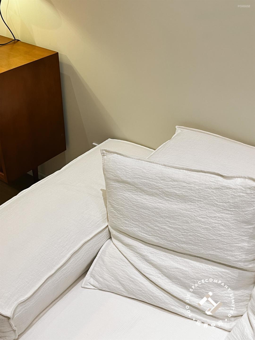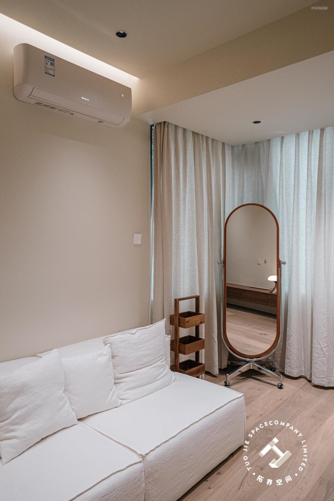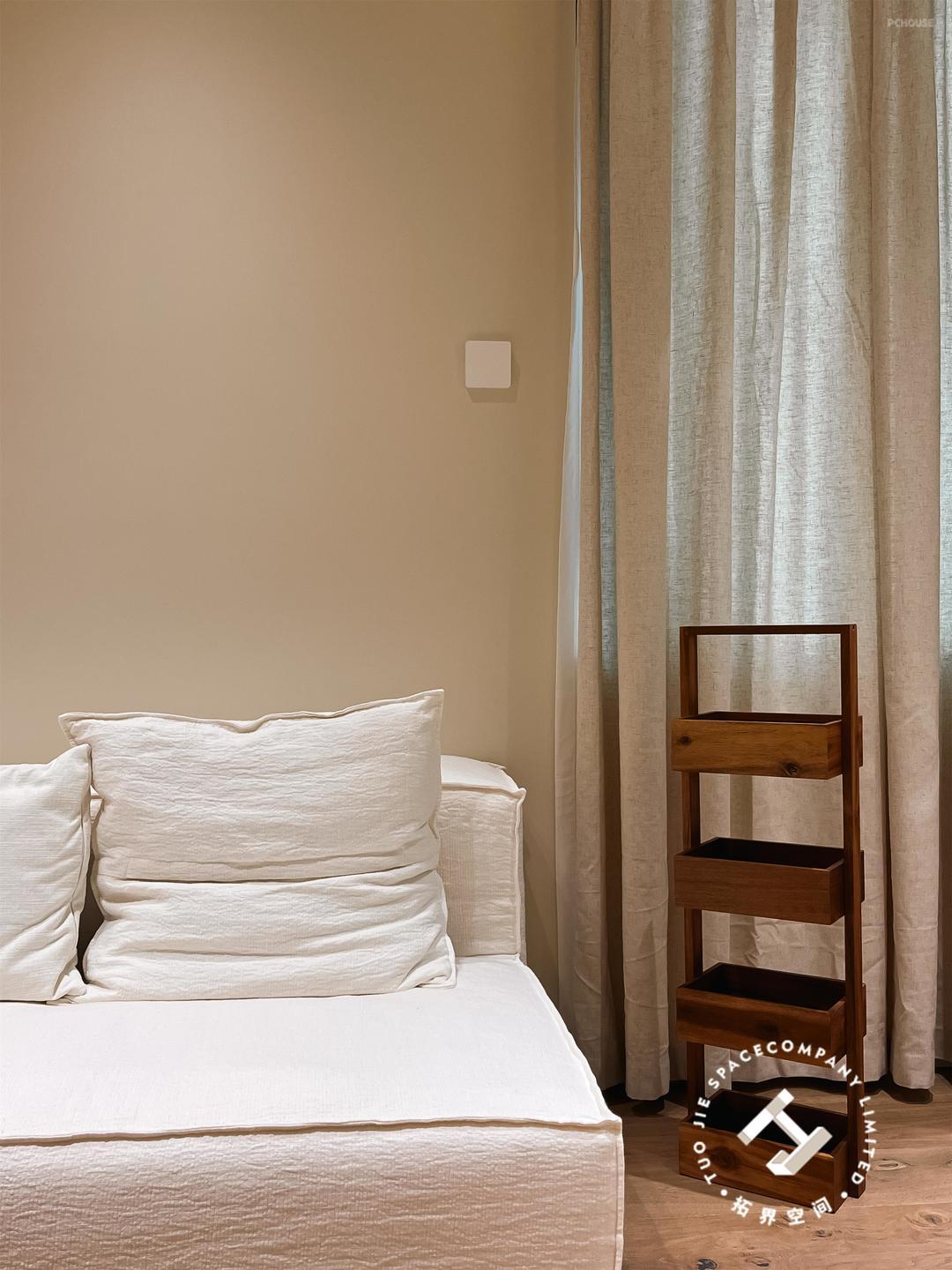 客厅中间业主选择了一款米白色豆腐块沙发,消减空间中较为暗沉的深木色,融入其中,给人一种简单干净的视觉体验。