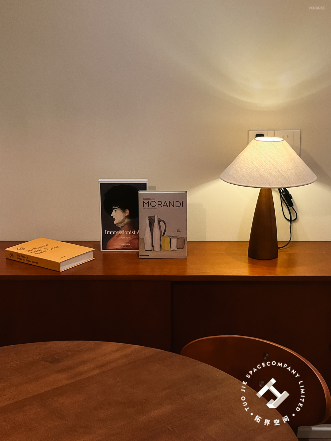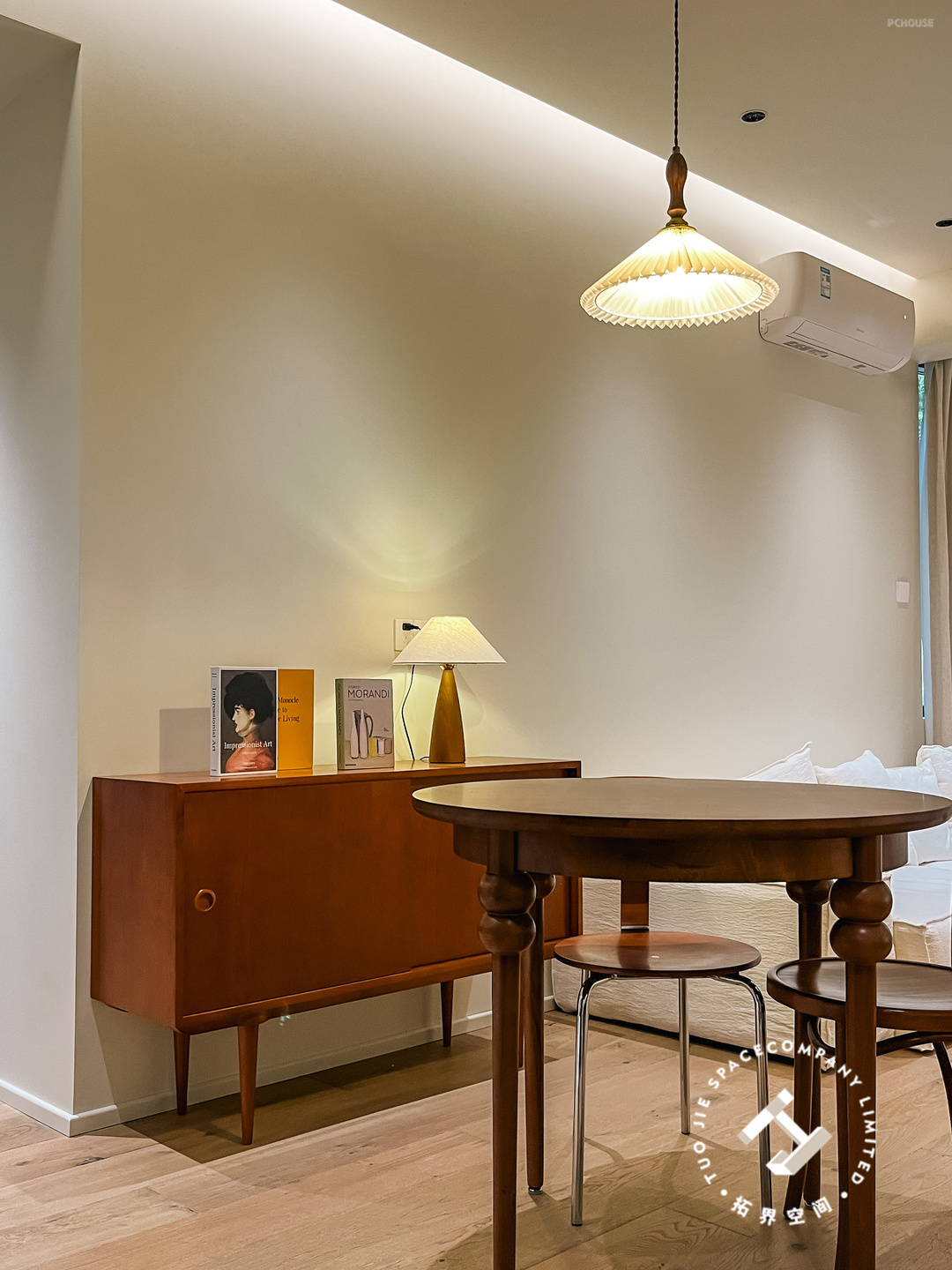 通屋刷上奶油色乳胶漆,配上胡桃木色的家具,在暖灯光的结合下,仿佛自带一层复古滤镜,营造出了一个氛围感拉满的居家空间。