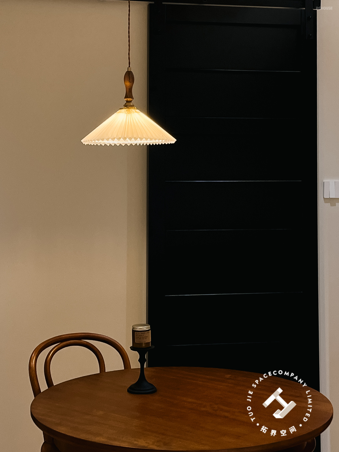 上方一盏百褶造型的吊灯,将光线过滤成朦胧的美感,映在餐桌上,彰显了不俗的品质,简约中增添了几分唯美的魅力。
