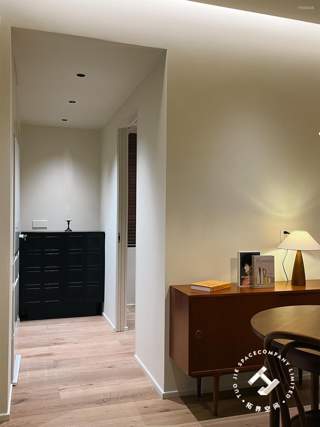 长长的走廊尽头是一个纯黑色的法式斗柜,个性十足又有一种高不可攀的错觉,让人眼前一亮既又怦然心动;侧面借用了次卧一点面积,将冰箱向次卧方向嵌入,完美融合。