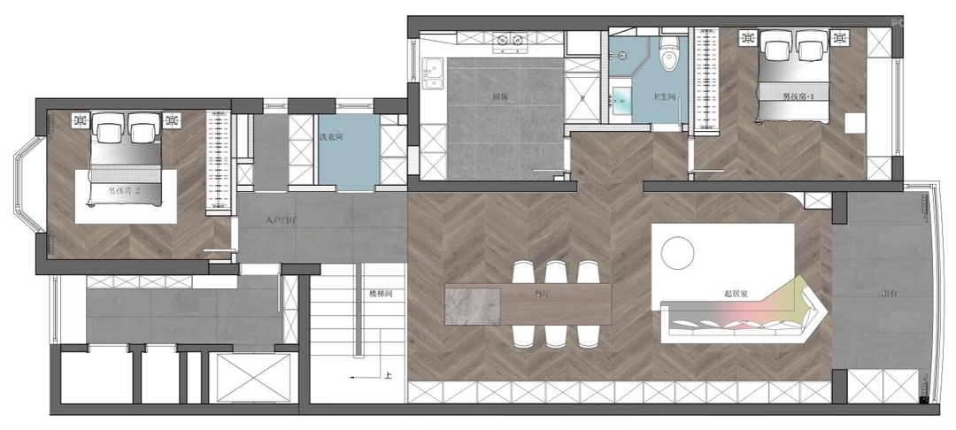 进入起居空间,客厅不同于以往规矩的设计,整体空间用自上而下的白色肌理,通过柜体的模块划分来展现出背景墙,同时可以容纳多种储物方式。家里有两个活泼调皮的男孩子。客厅的沙发采用的是灵活度比较高的慵懒沙发,孩子可以客厅自由的玩耍