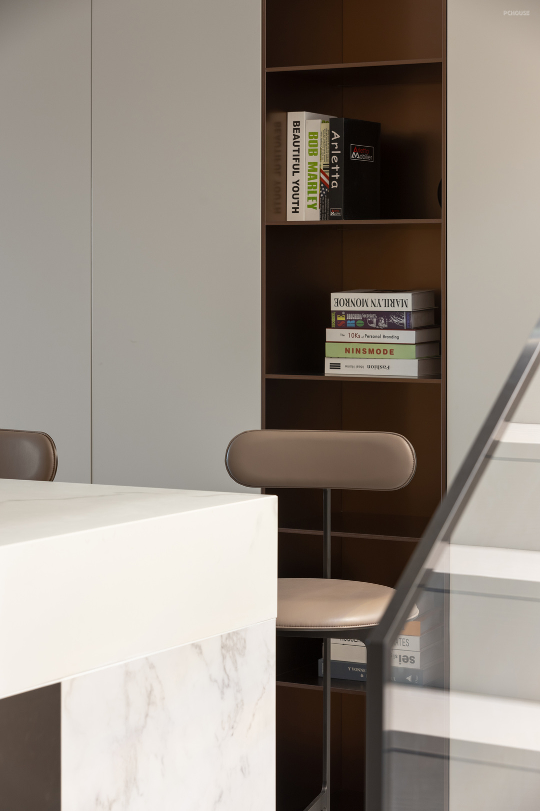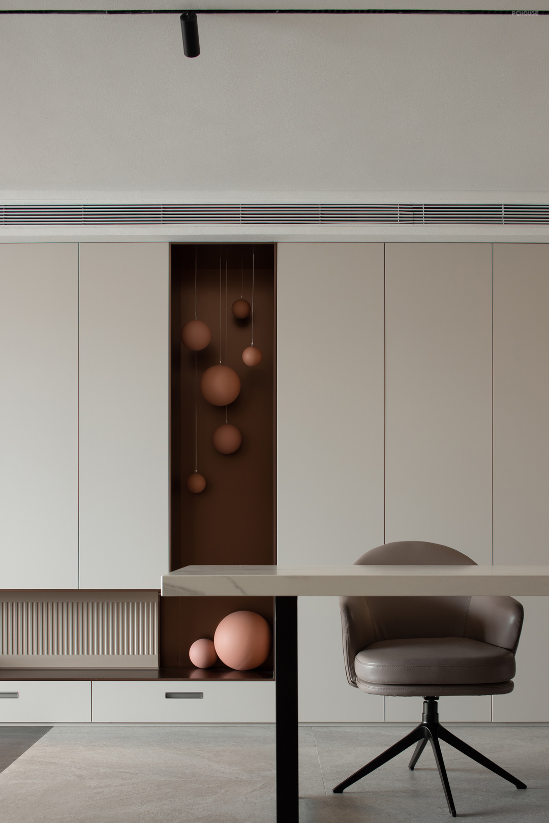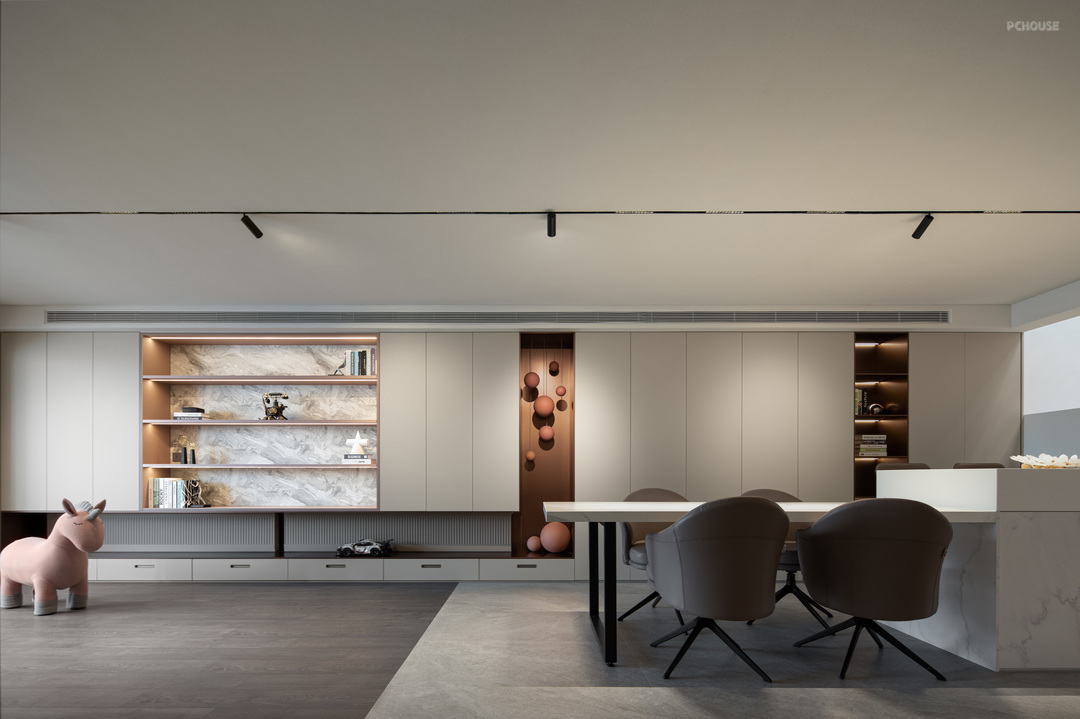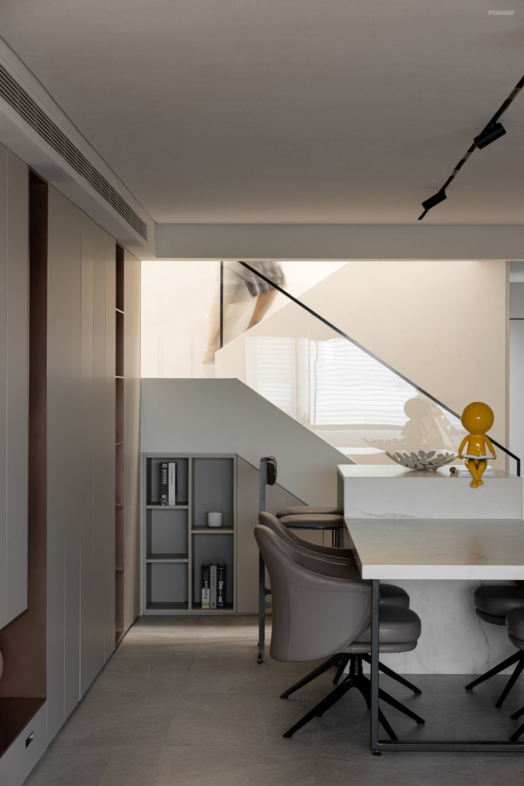 餐厅区域与岛台的连接同时容纳多人一起,岩板的桌面搭配跳色的餐椅,看以来干净又有质感。当然这里不只是享有美食的地方,也可以作为学习,办公区域使用。背后与客厅连接的储物柜最大限度的满足空间的储物量。后面的整理柜满足了大量的储物空间的需要