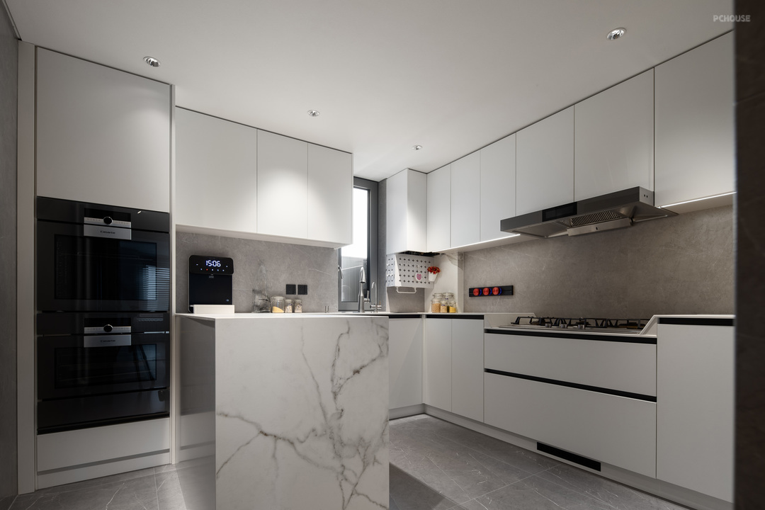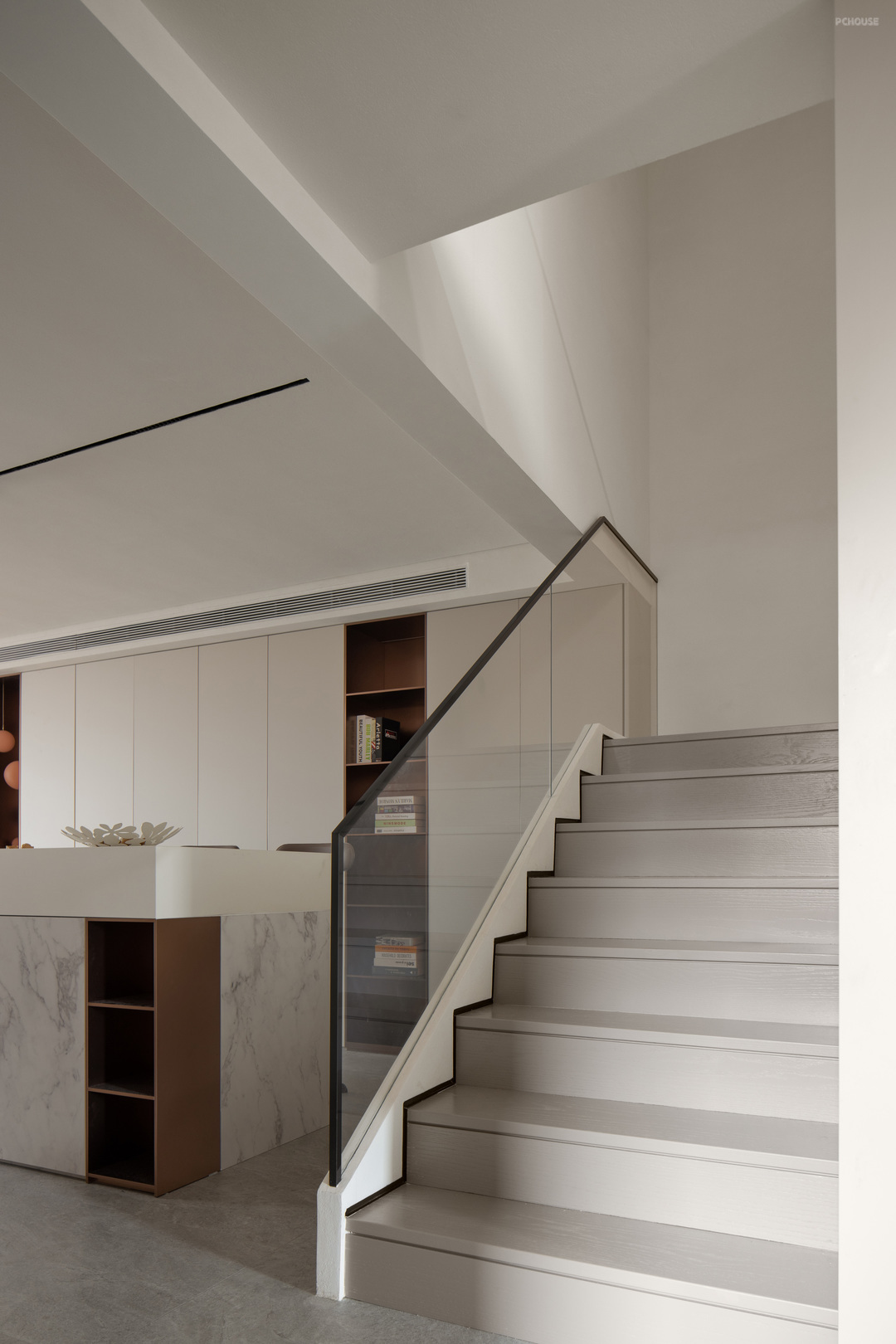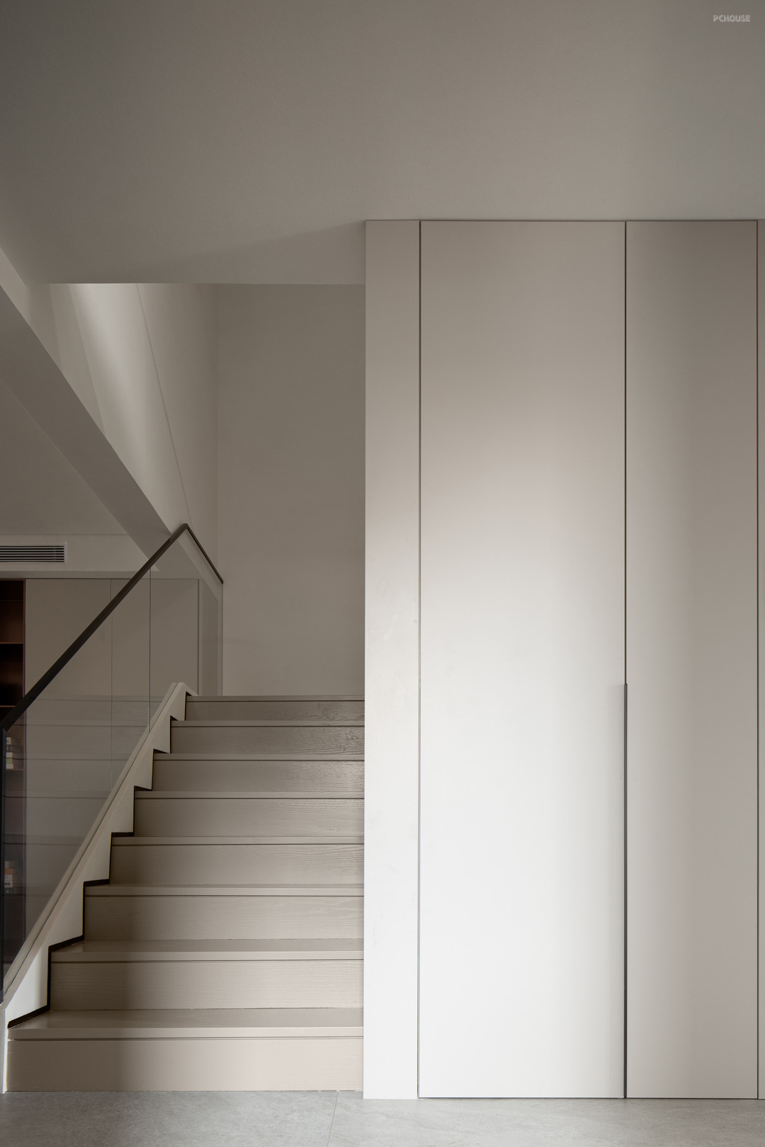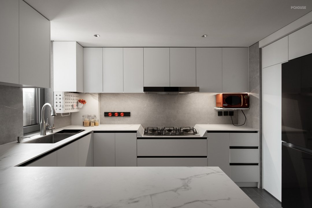 餐厅区域与岛台的连接同时容纳多人一起,岩板的桌面搭配跳色的餐椅,看以来干净又有质感。当然这里不只是享有美食的地方,也可以作为学习,办公区域使用。背后与客厅连接的储物柜最大限度的满足空间的储物量。后面的整理柜满足了大量的储物空间的需要