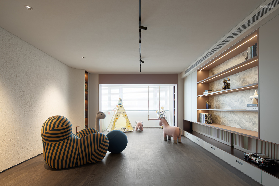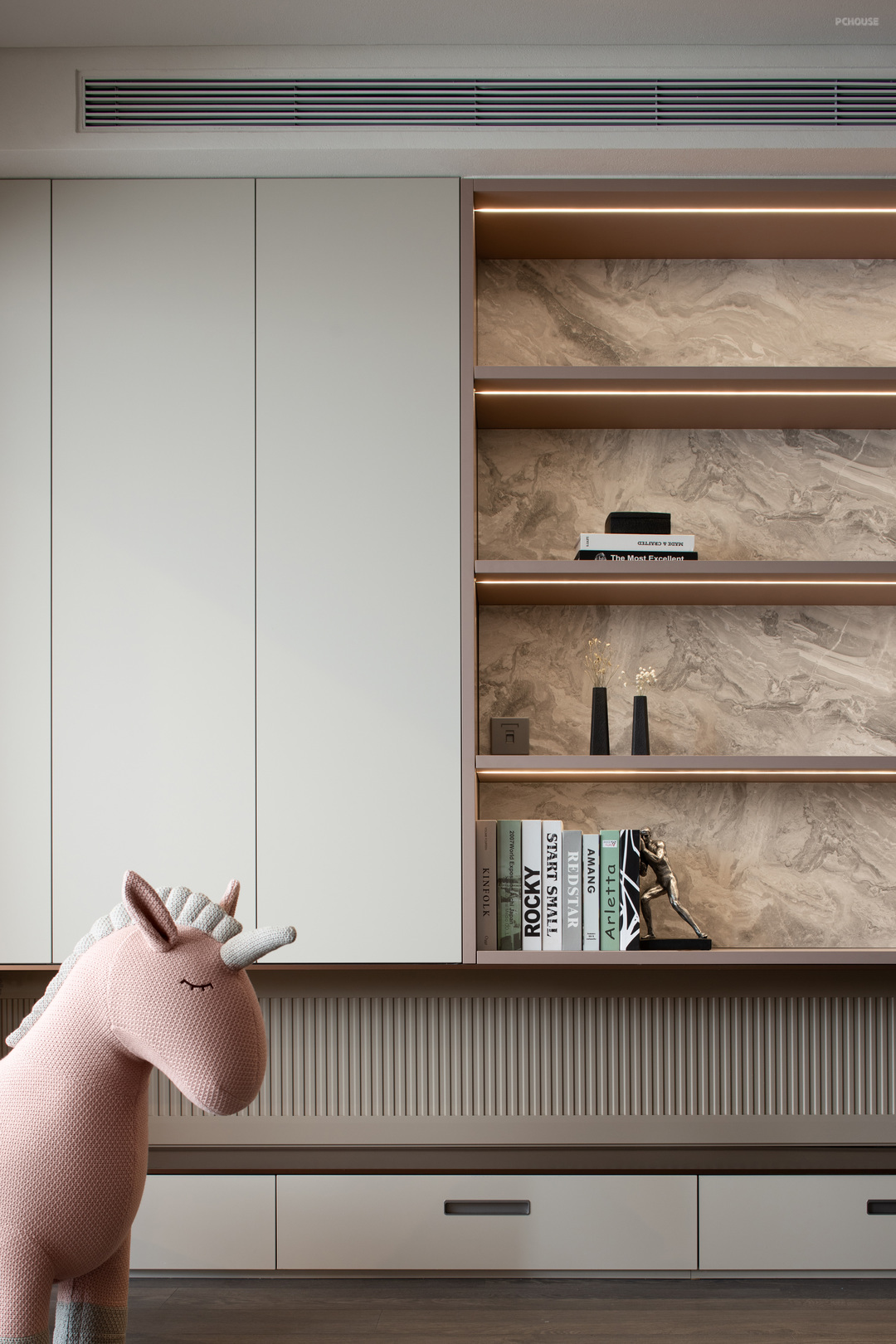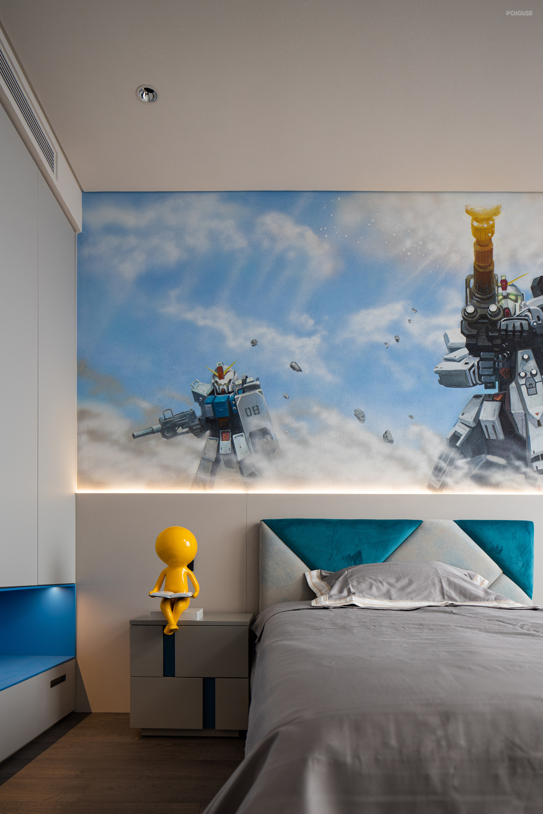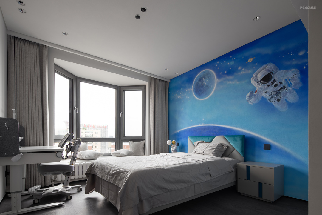 两个儿童房运用了比较科技的元素,孩子在空间里有种身临其境的感觉。衣柜的悬空设计在视线上解决了拥堵感,悬空处设计了感应灯。书桌侧面的开放格方便孩子的使用,从正面视线看上去是个门板,在视线上整体化一