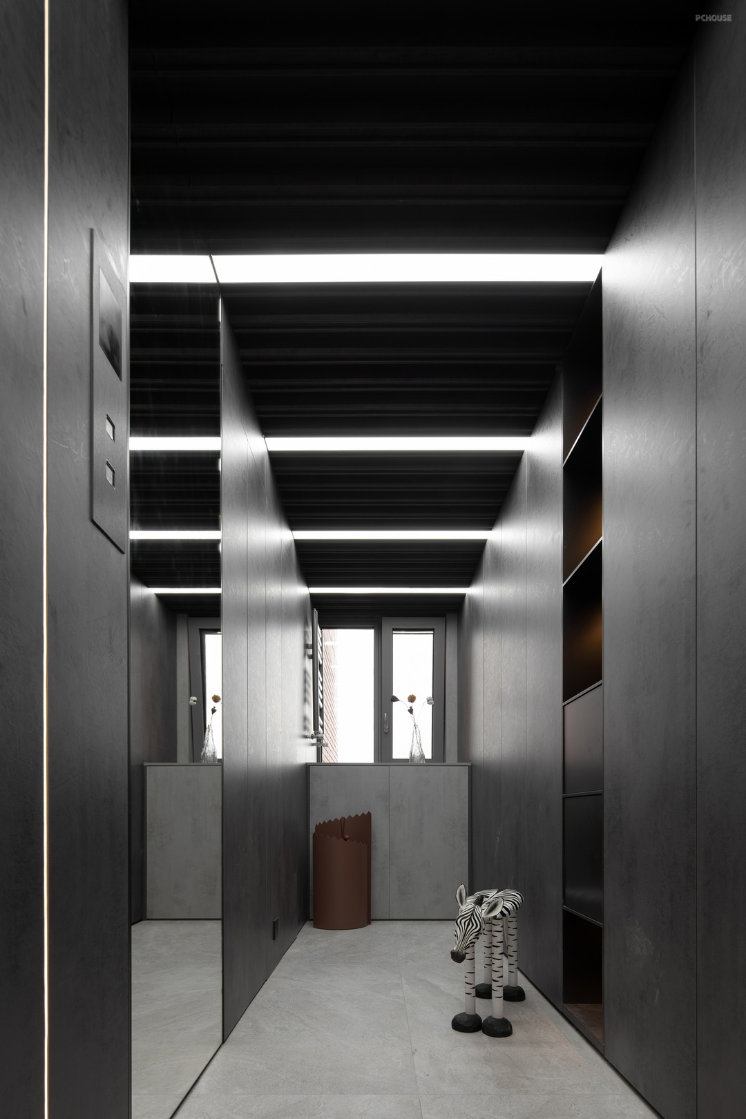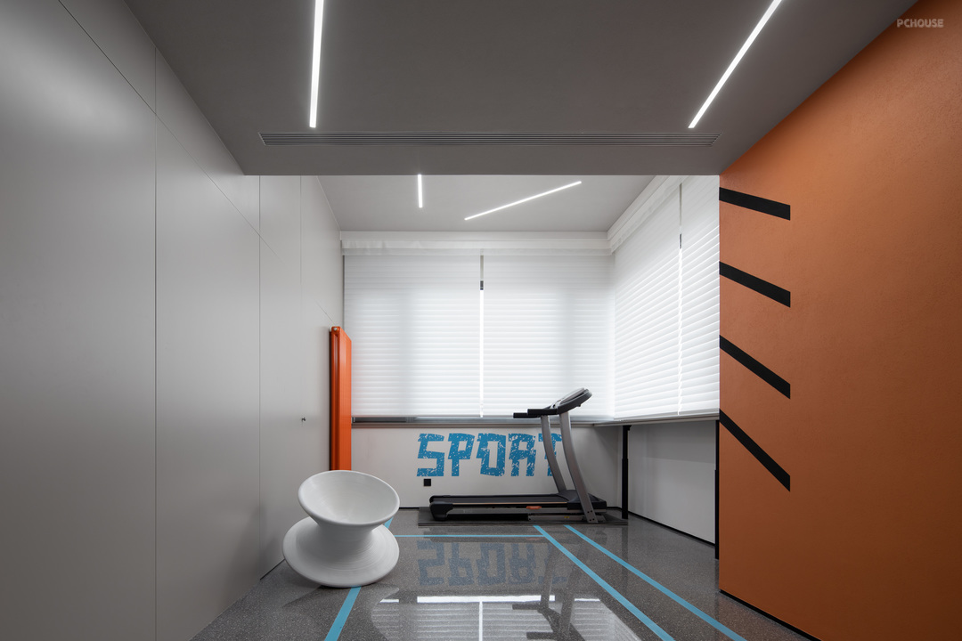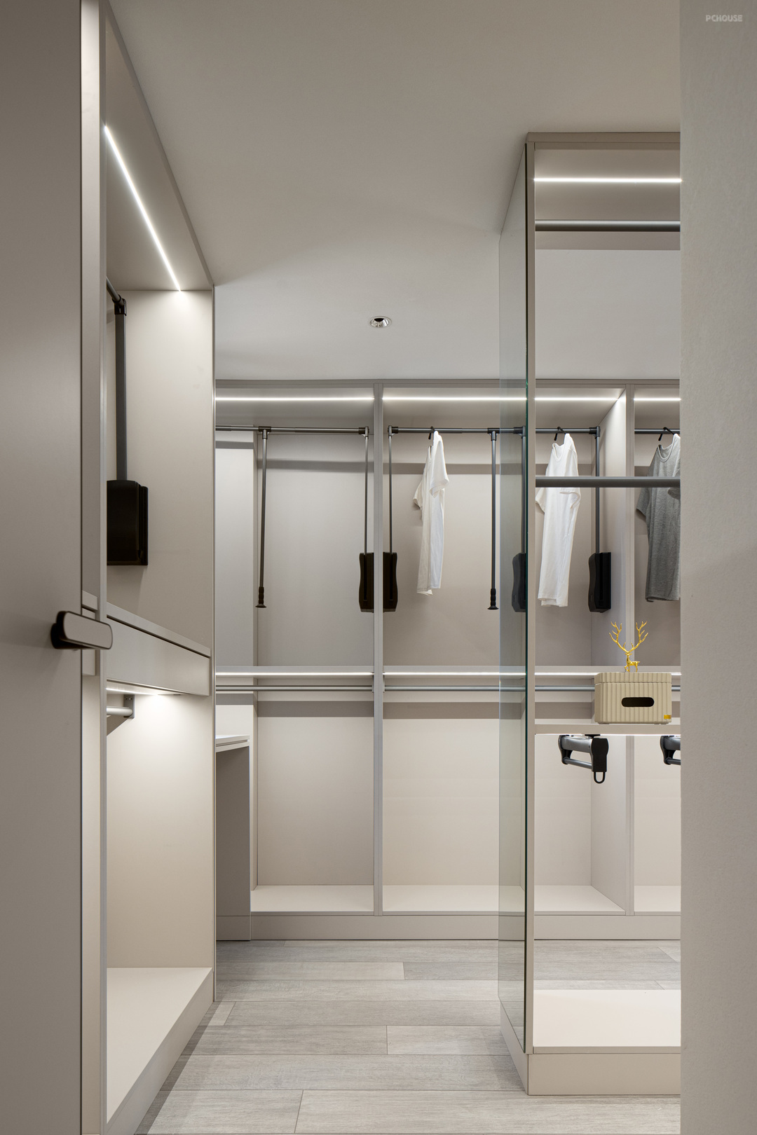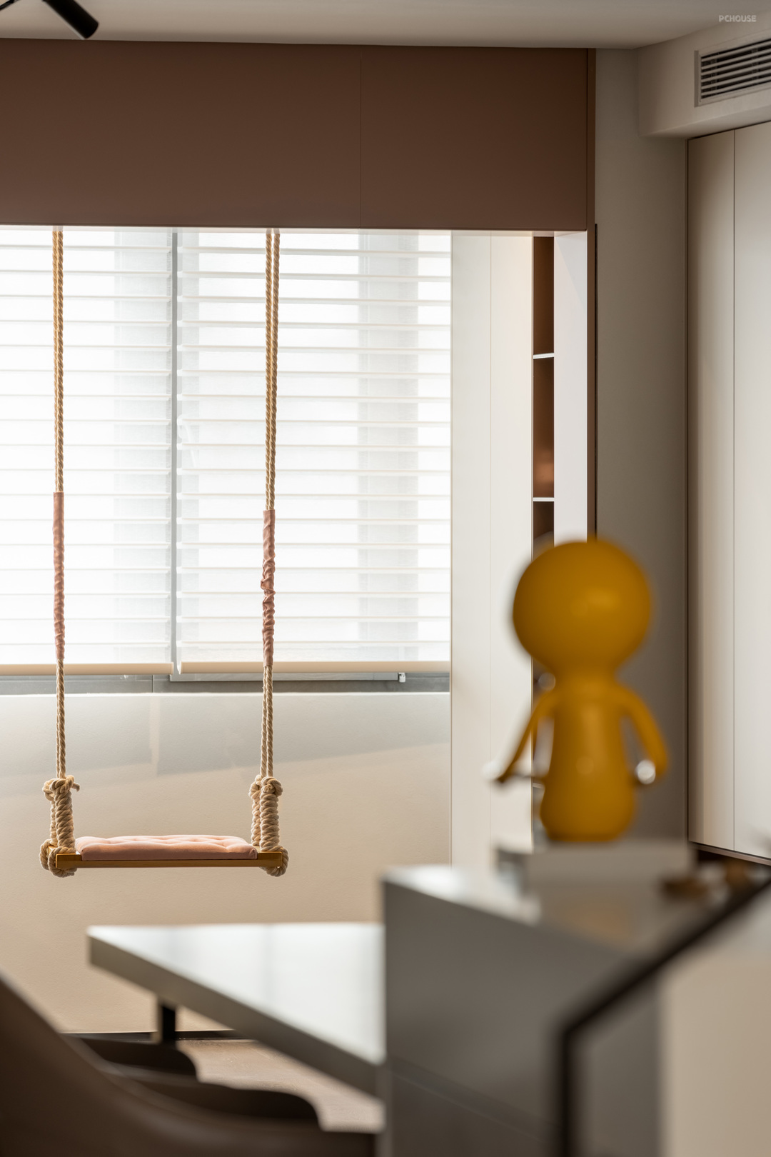两个儿童房运用了比较科技的元素,孩子在空间里有种身临其境的感觉。衣柜的悬空设计在视线上解决了拥堵感,悬空处设计了感应灯。书桌侧面的开放格方便孩子的使用,从正面视线看上去是个门板,在视线上整体化一