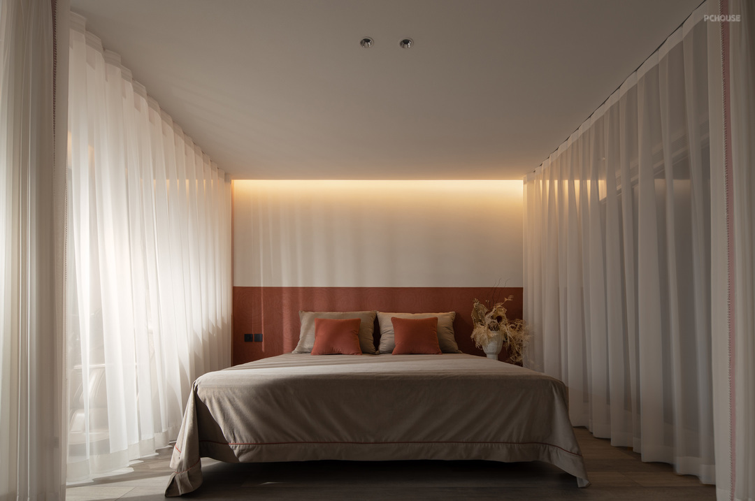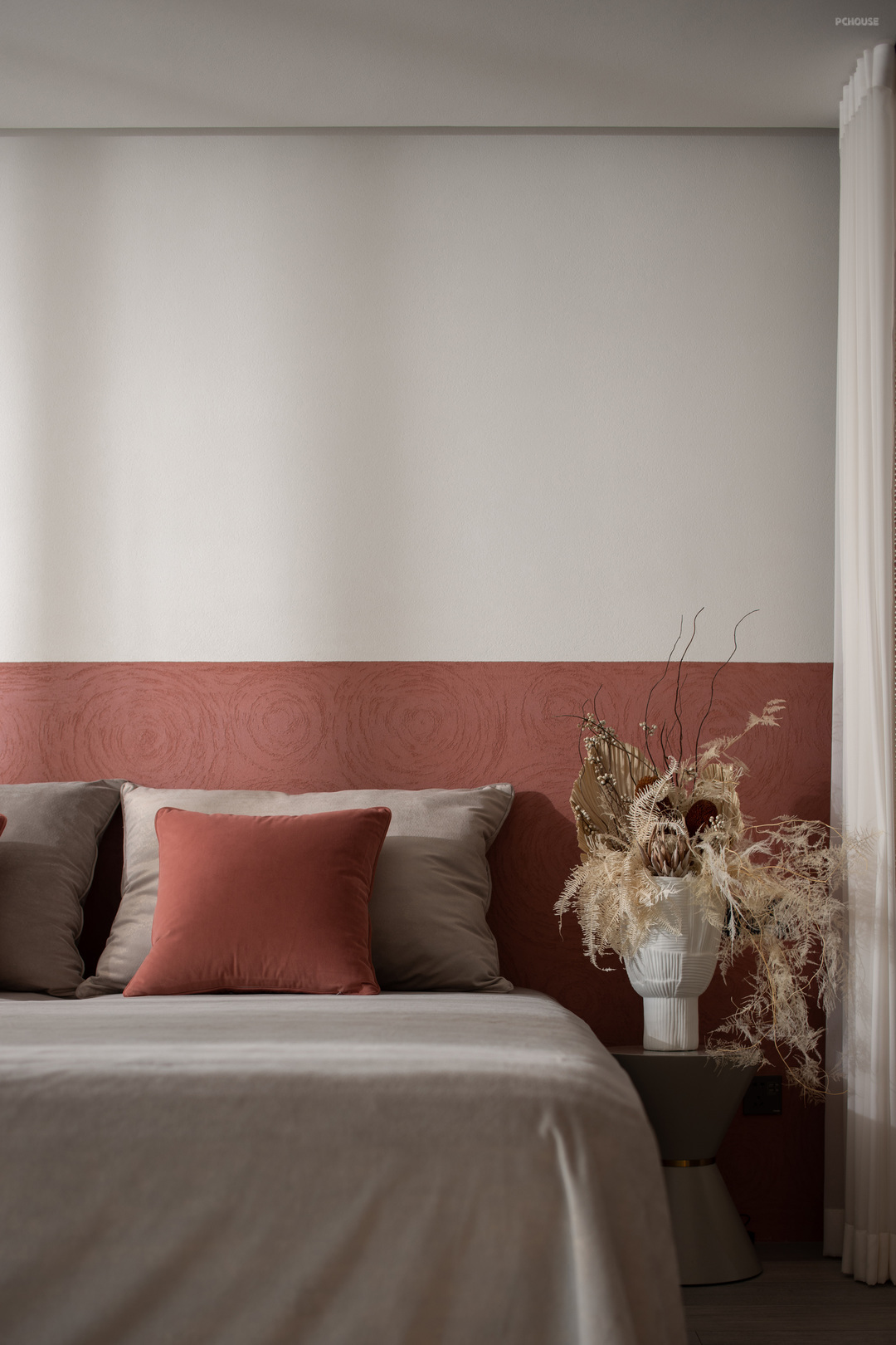 主人房运用柔和的色彩组合,营造出舒适的居住空间。顶面采用了线性分割的方式来打破了枯燥无味的平顶,卧室墙面采取了肌理感的材质,床头采用了富有色彩的床头背景,使房间既温馨同时又不是高级感