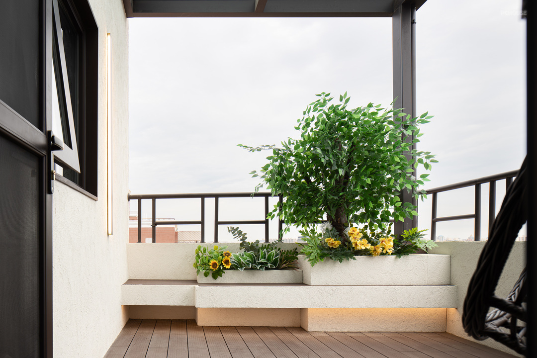 顶层露台还常常设计为一个休闲空间,配置有绿植既美化了环境,又为居住或办公的人们提供了一片远离喧嚣、亲近自然的小天地。在这里举办聚会、进行瑜伽冥想或是简单地品一杯咖啡,都是极好的享受,让生活在忙碌与自然、繁华与宁静之间找到了完美的平衡。