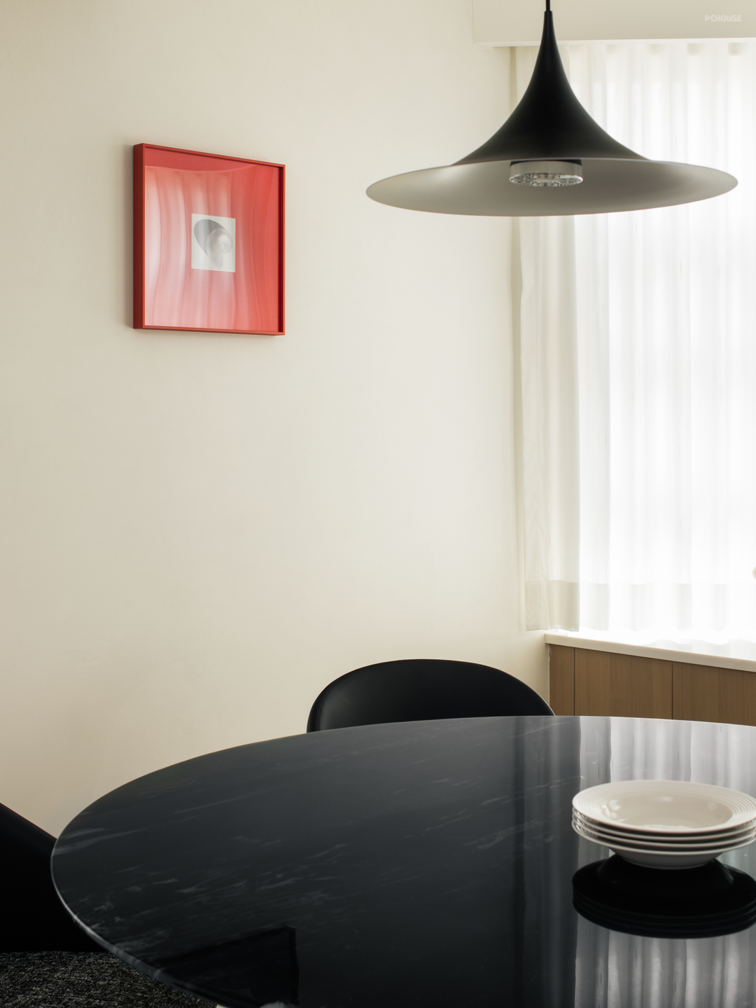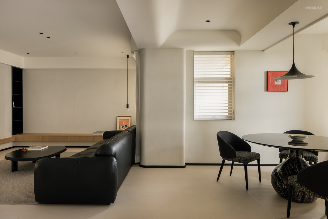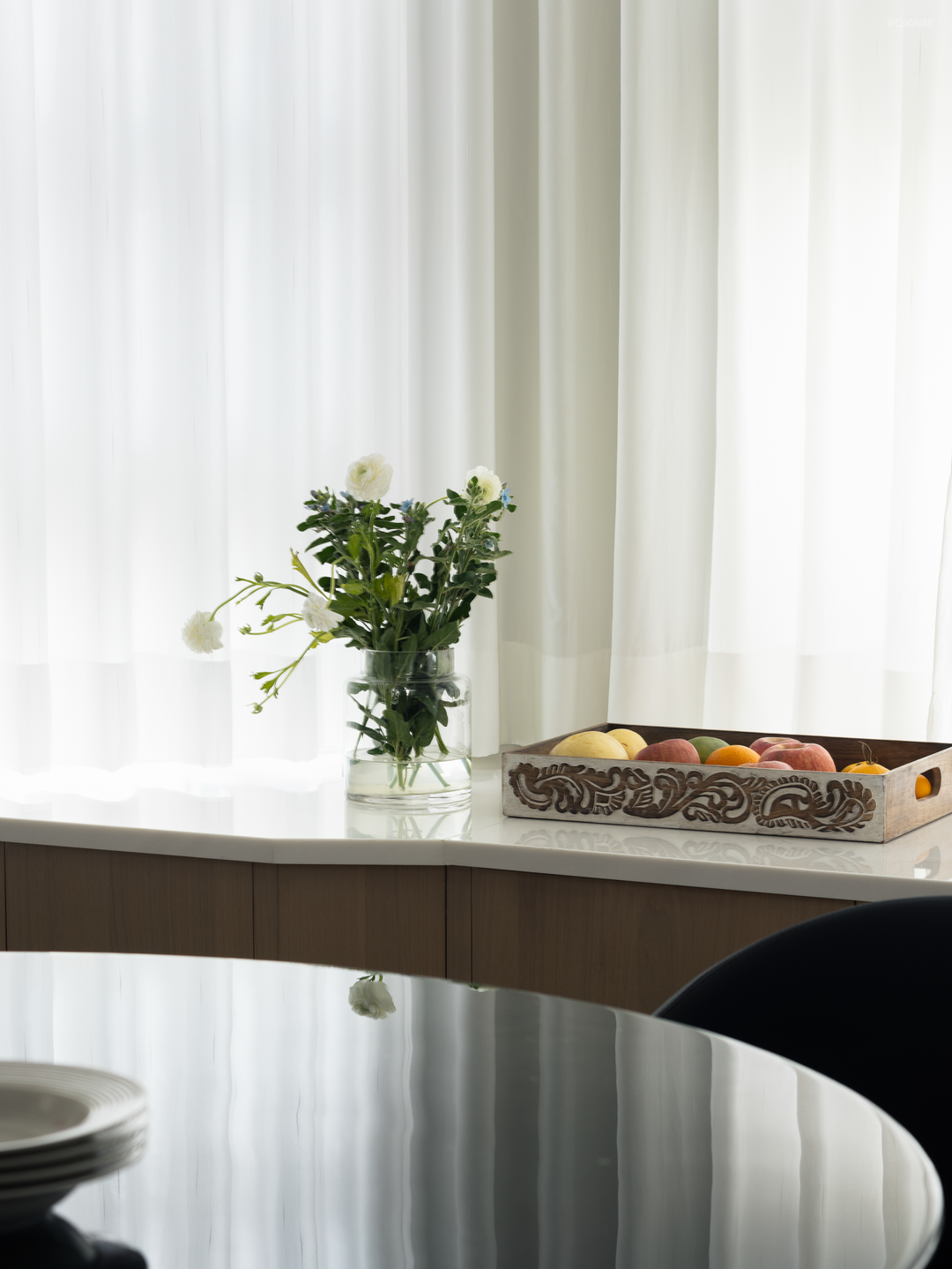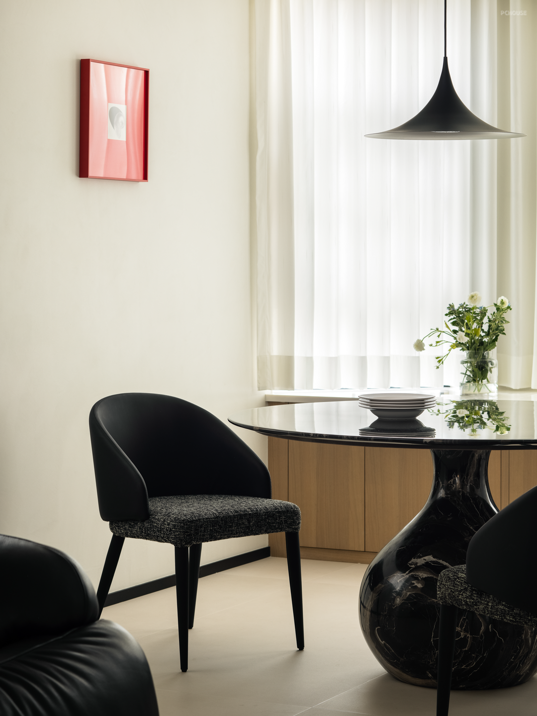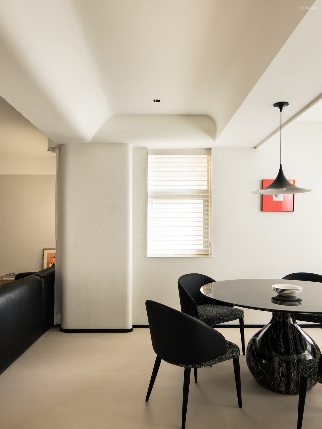 客厅与餐厅相连,一张圆桌精致与中心区域,其柔和的设计语言散发出温暖宁静的氛围,动静转换之间,空间成为实实在在的生活之所。