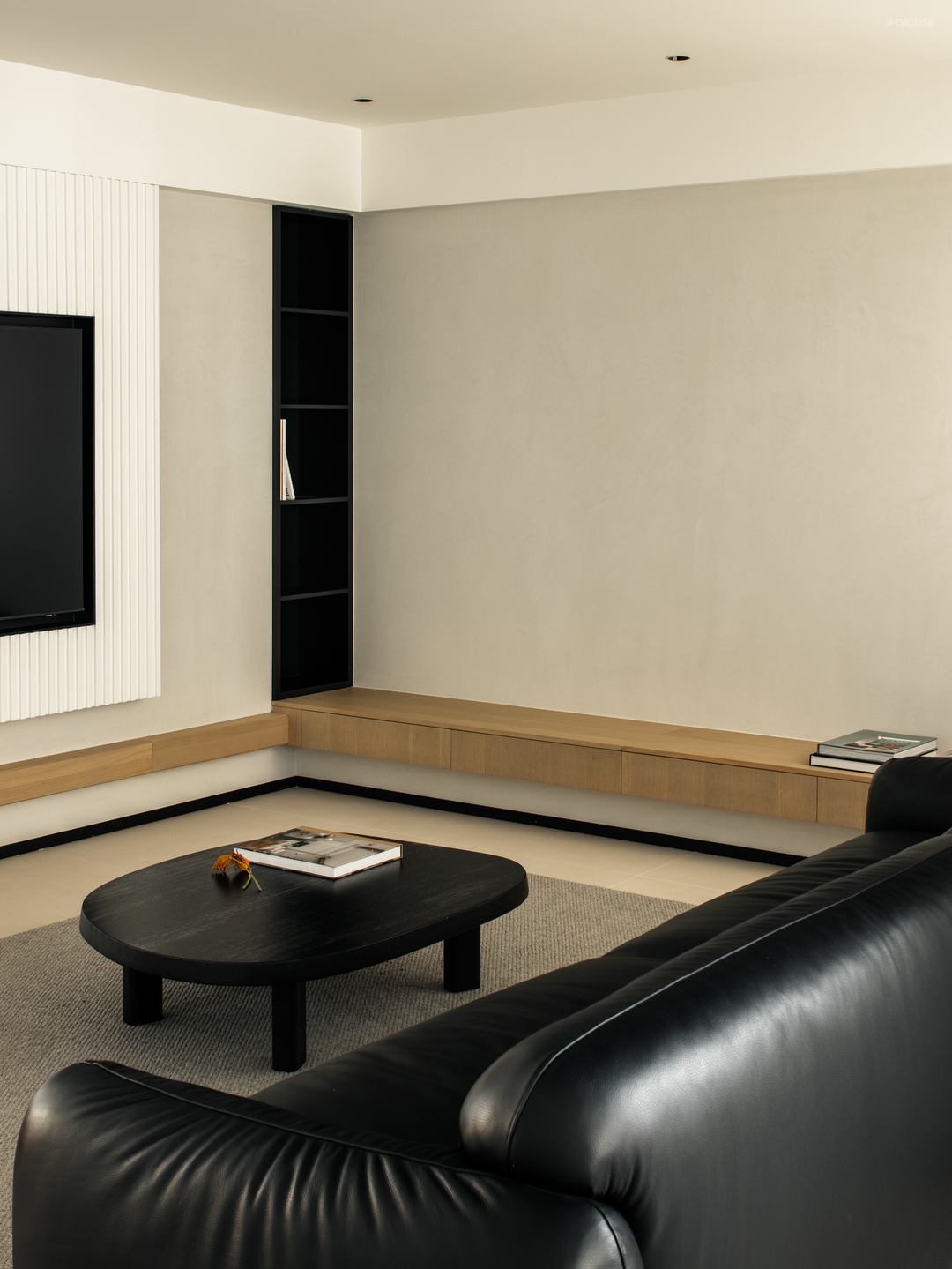在快节奏的生活中,车水马龙的喧嚣声此起彼伏,空间不再是生活的场所,更是精神寄托的容器。米白的底色成为空间的场景背景,黑色的线条附着之上,黑与白、面与线的组合碰撞,勾勒出简洁而不失力量的美感。