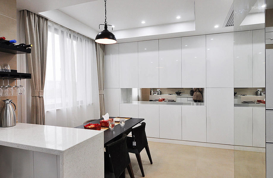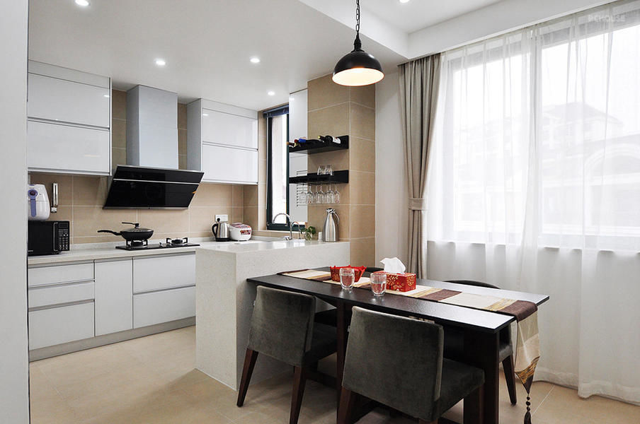开放式厨房,与餐厅仅一个吧台的距离。纯色橱柜,硬朗线条,简约却不失时尚。