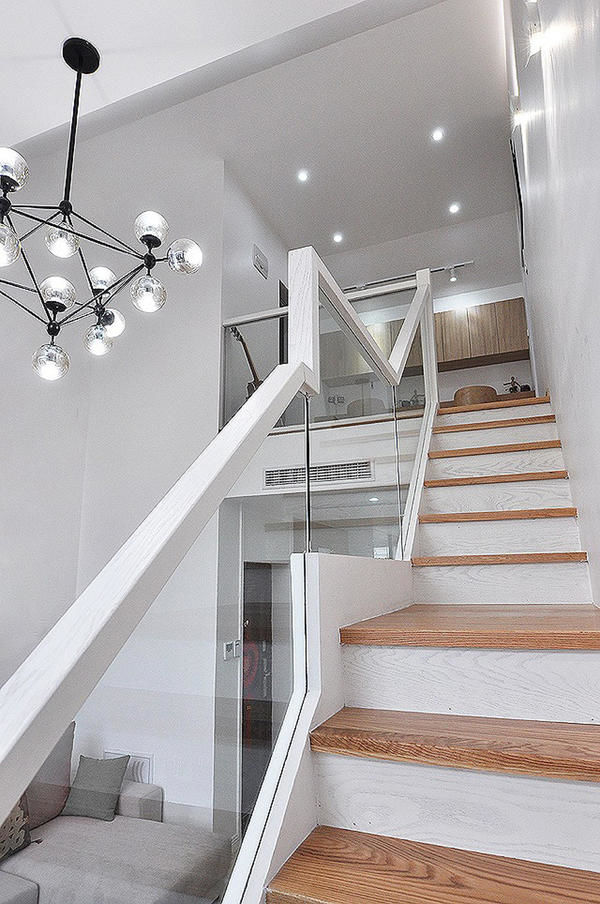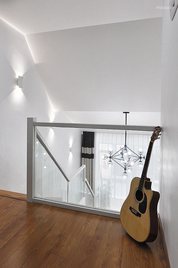 穿过客厅,踏上通往上层的楼梯。阳光透过纱帘,亮厅的光感刚刚好。