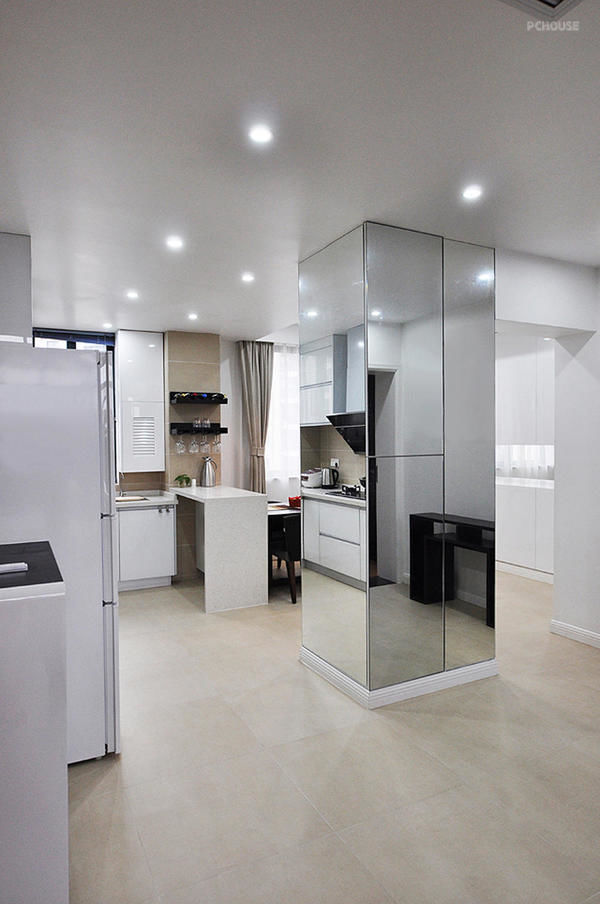 中间那根柱子着实碍眼,包上镜子使其“隐身”。不得不说,人靠衣装墙靠镜装,看它改头换面得还挺像回事,瞬间原谅它的存在了。