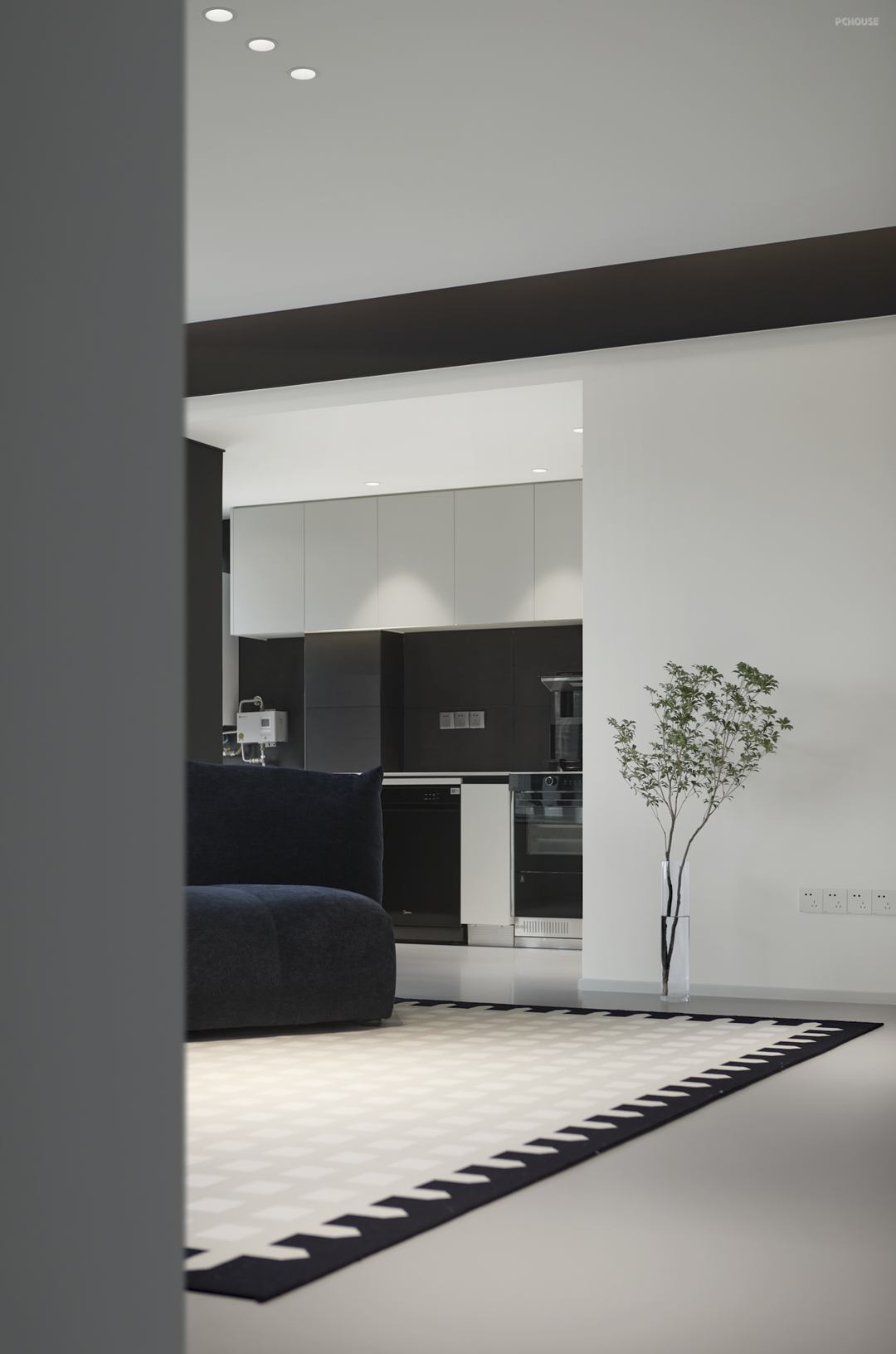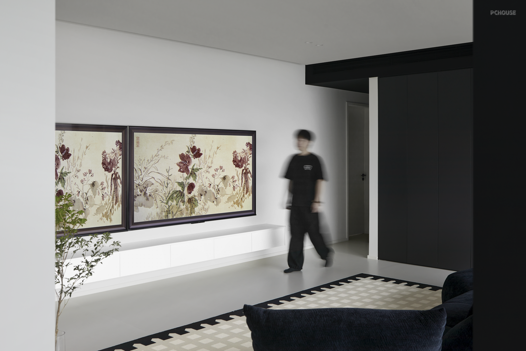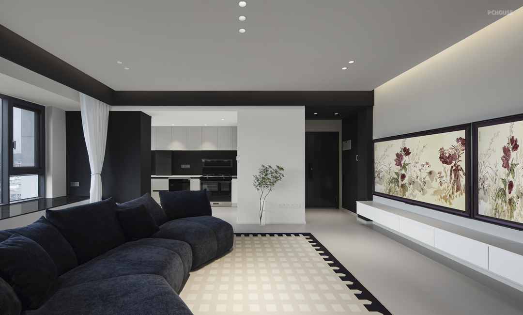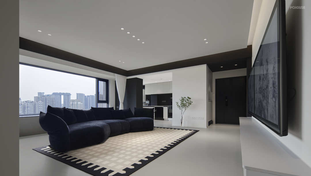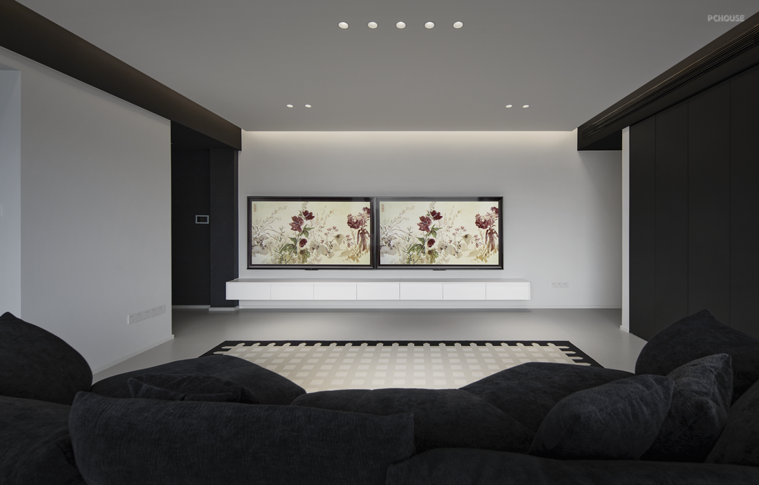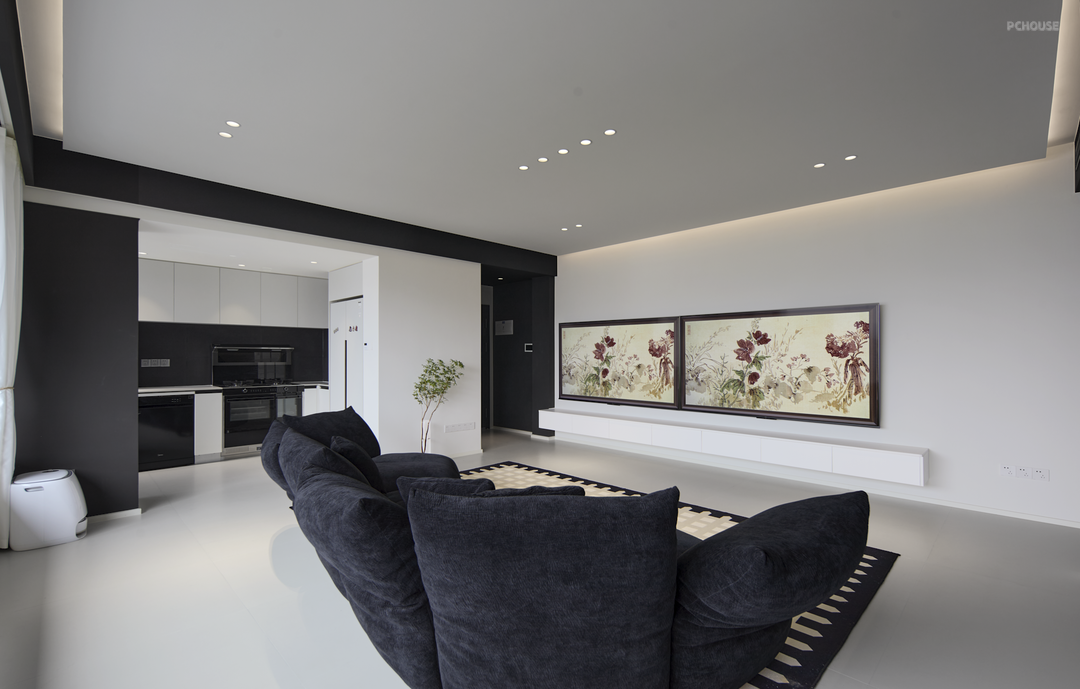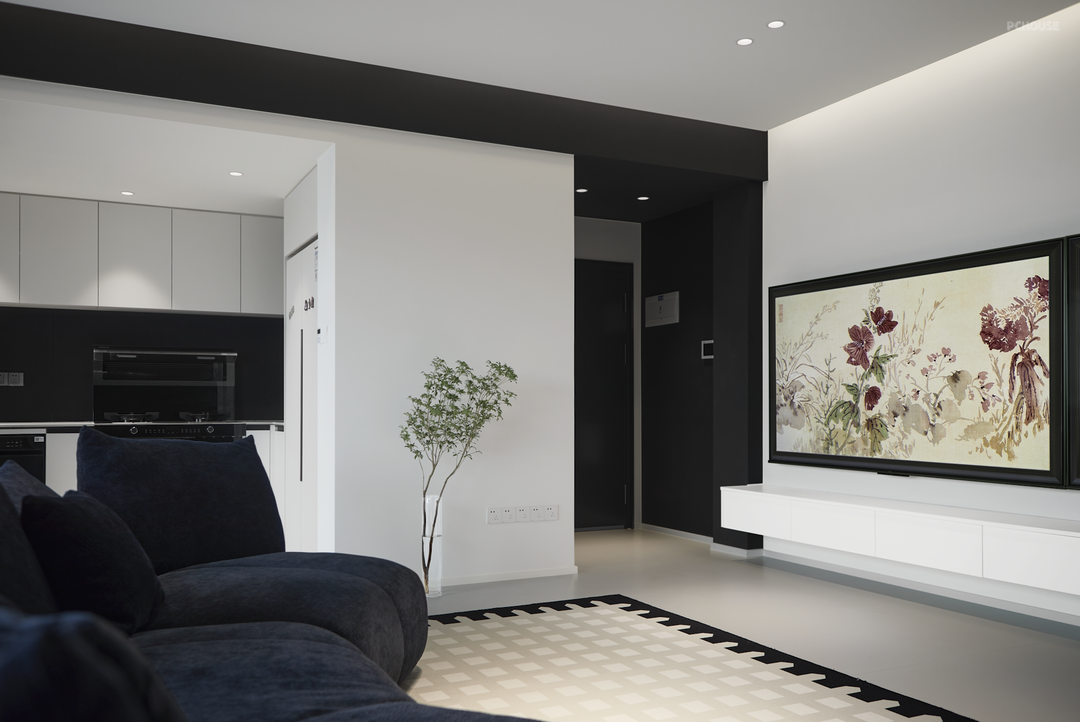 主要居住人口是夫妻两人,以及两只可爱的小猫咪。屋主希望客厅能够宽敞明亮,喜欢黑白极简的装修风格。设计师通过简洁的设计和黑白的碰撞来达到美观和宜居的效果,在去繁求简的原则下,增加空间的亮度和舒适度。