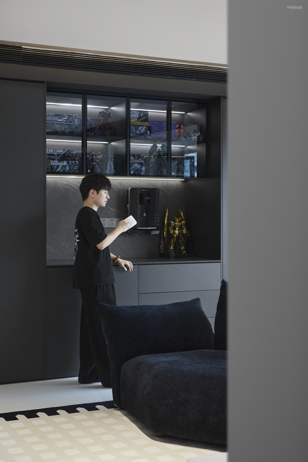 客厅右边做了到顶的定制储物柜,中部的玻璃展示区域内嵌灯带,明与暗相结合,提升空间层次感,同时也能满足屋主展示手办需要的灯光。