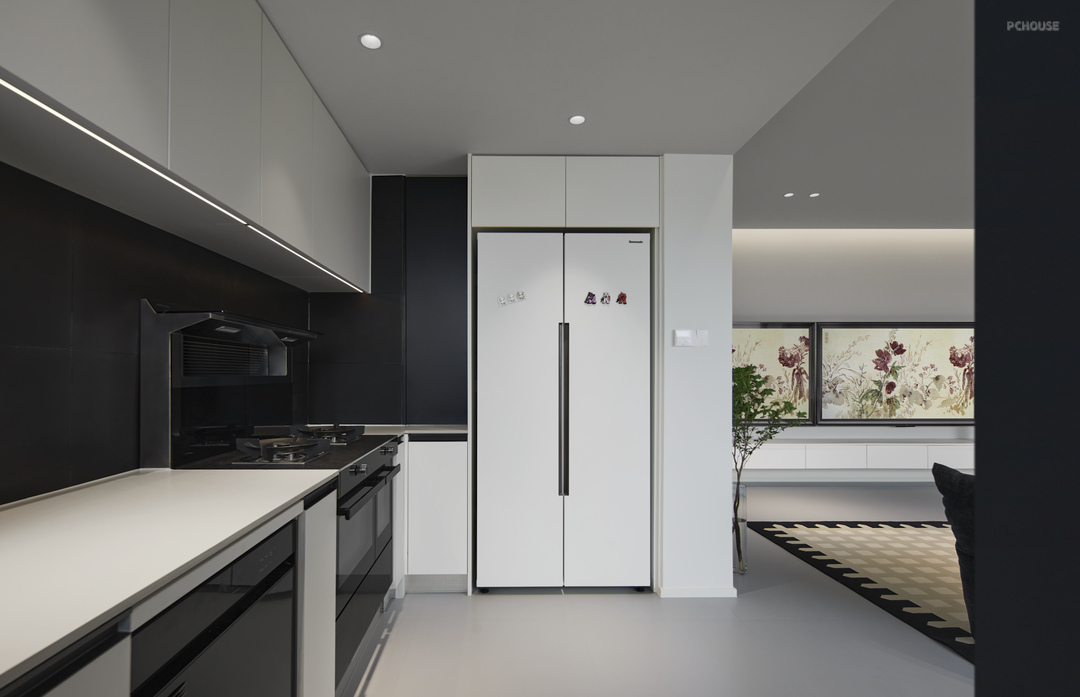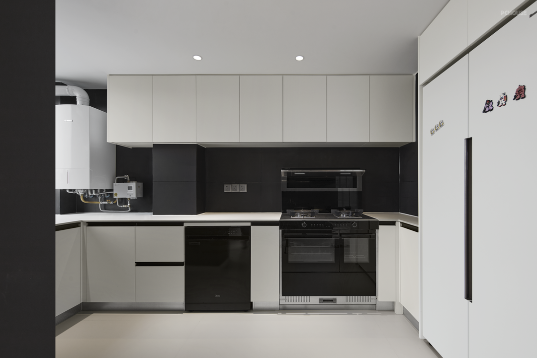 厨房同样延续整屋黑白极简的色调,采用"U"型布局,充分利用空间。