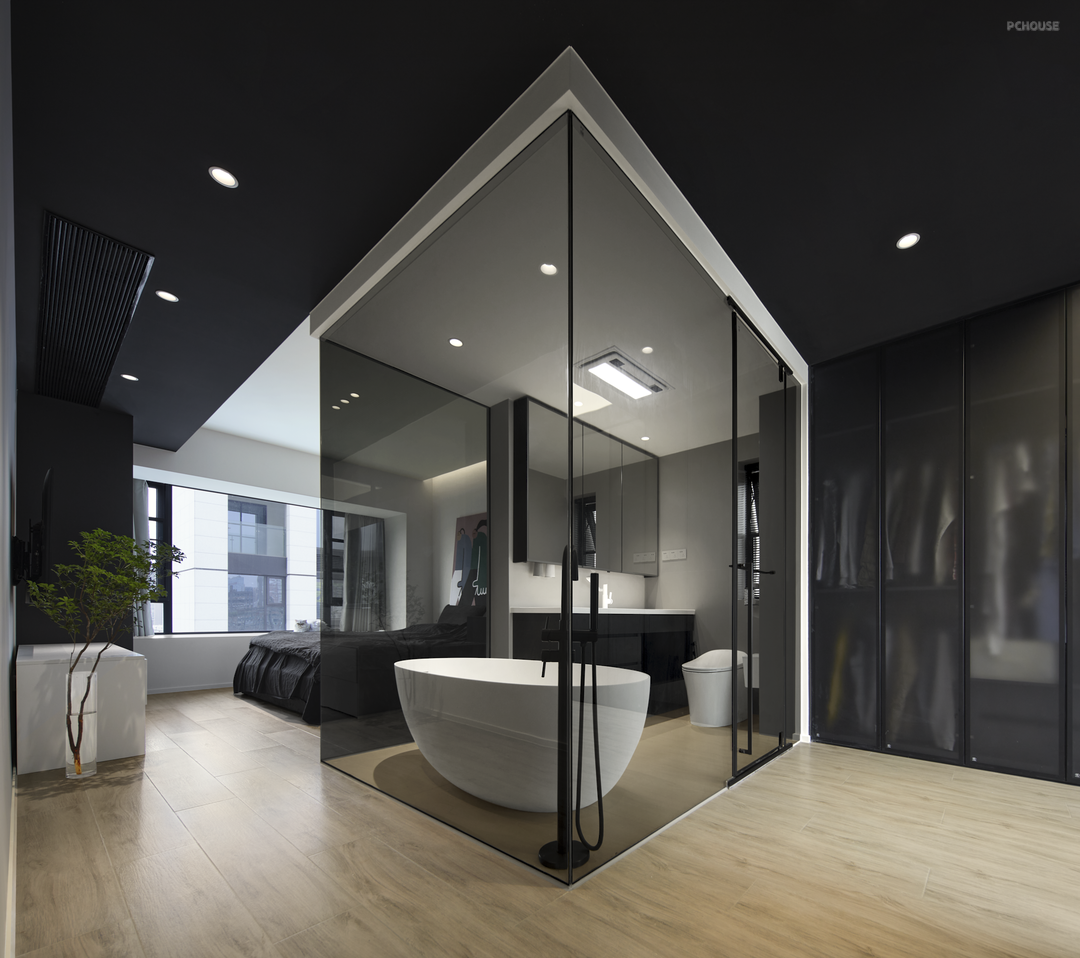 卧室进门左侧就是主卫生间,用透明的玻璃代替实体墙,减少空间阻碍,让自然光延伸,视觉上会更显大,更加通透明亮。整个浴室成“正方形”布局,各个功能区域划分明确,舒适感满满。