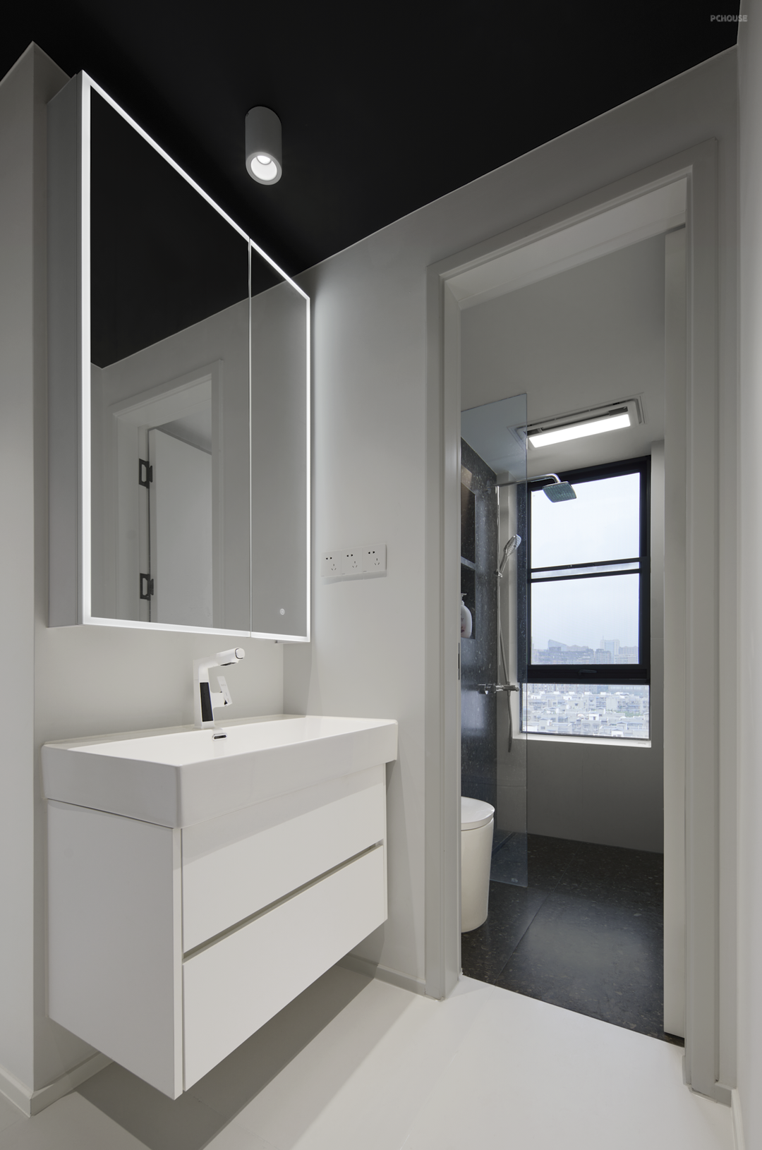 次卫生间做干湿分离的布局,功能独立,提升使用效率。奶白色浴室柜+镜柜的形式,镜面和顶面都有灯,方便平时洗簌、化妆。台盆悬空,清理打扫更方便,下方还能放个扫地机。