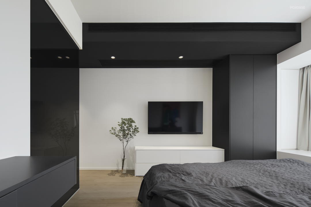 床尾放白色电视柜,布置上电视机,满足屋主晚上看电影,看新闻,看完直接关上电视睡觉,非常方便~