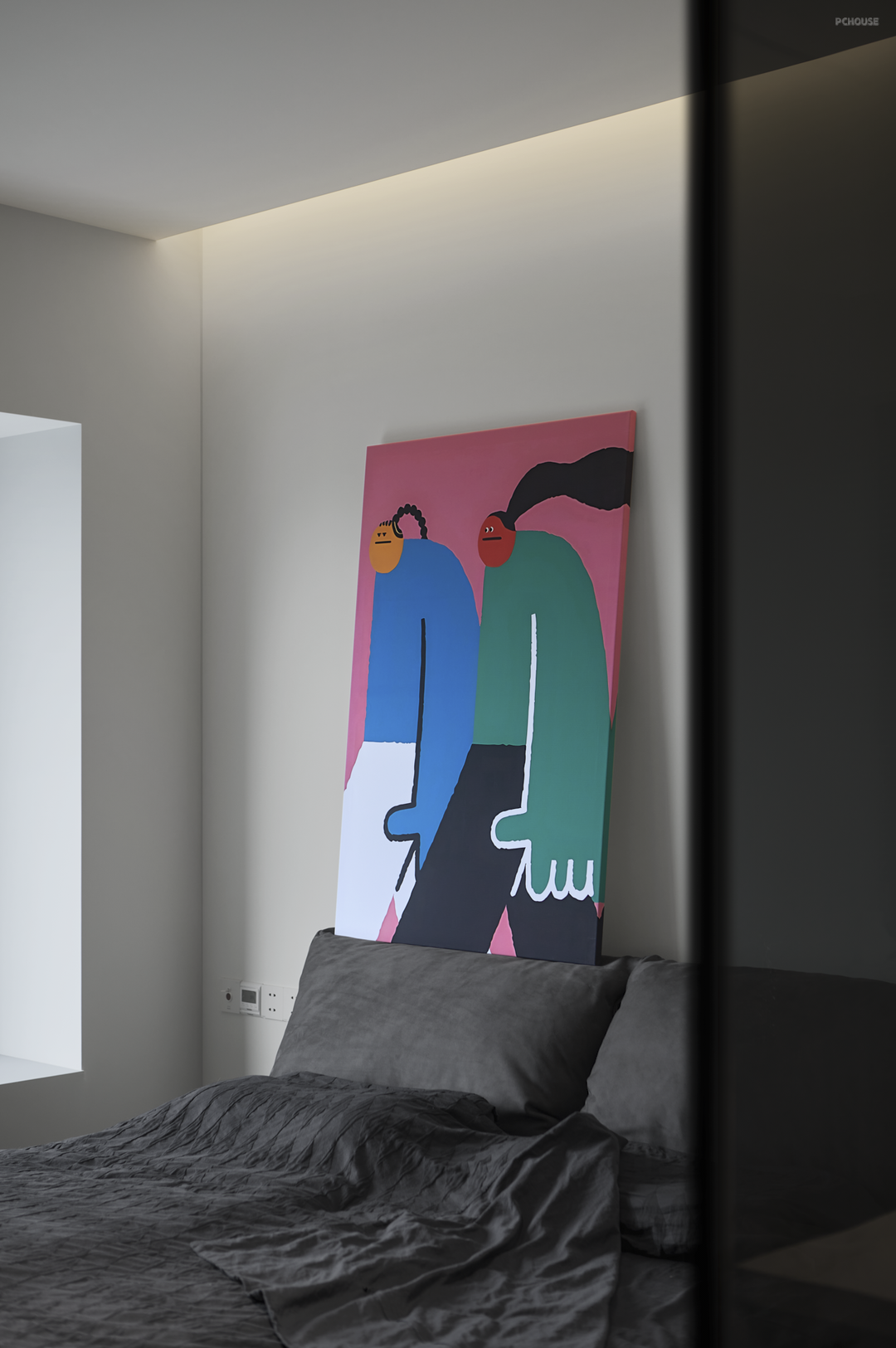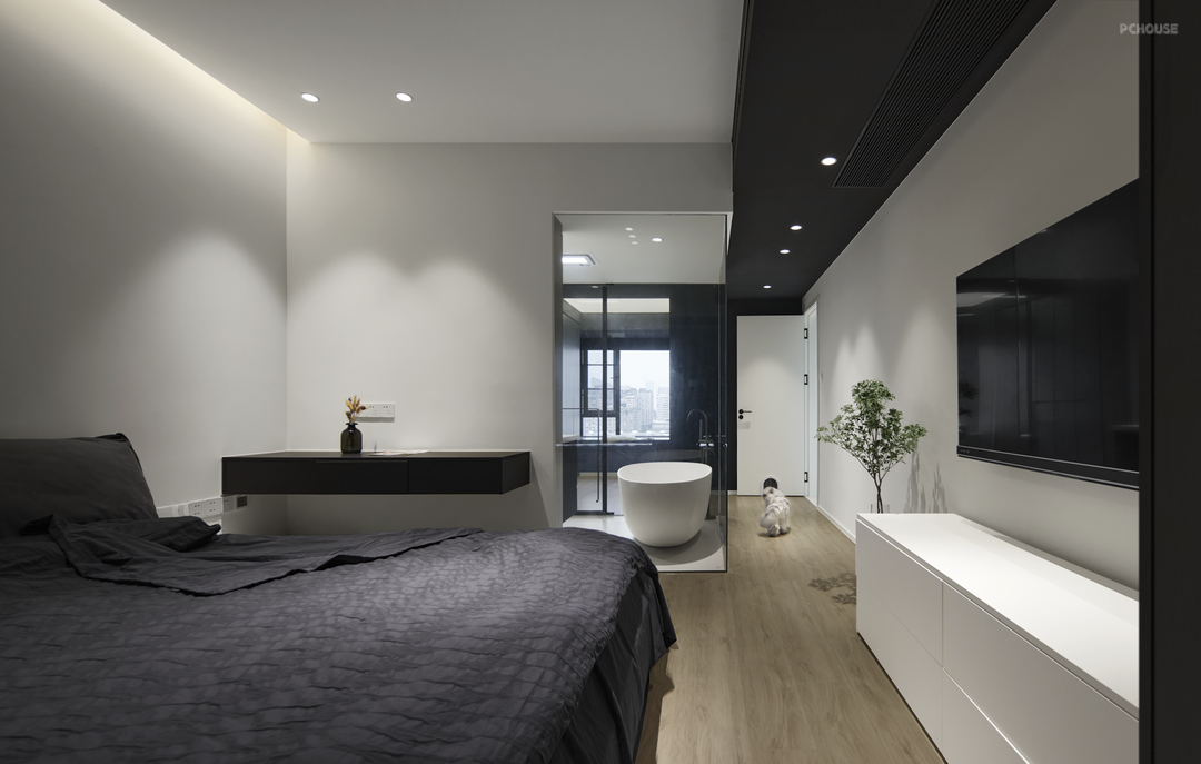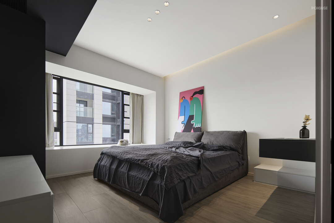 卧室继续延续整屋的黑白色调,加上灰色四件套,营造静谧的睡眠感。