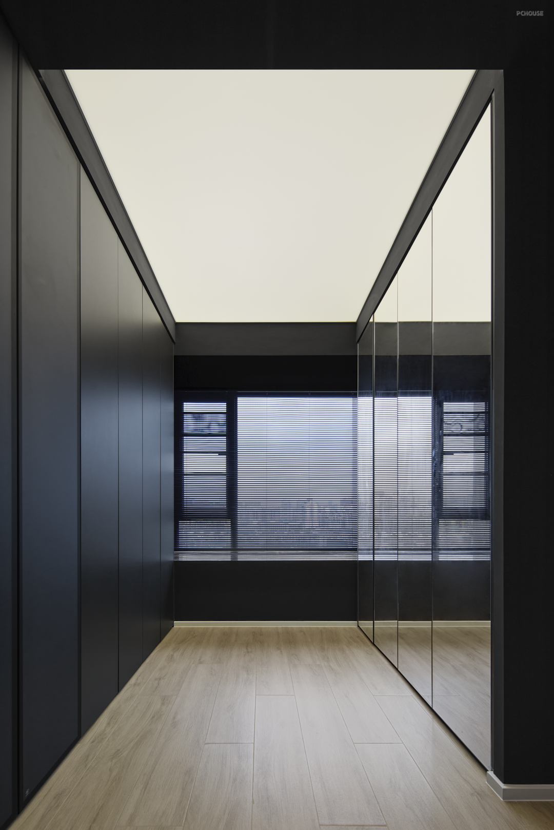 衣帽间在卧室的右侧,步入式设计,两面靠墙均做定制到顶储物柜,轻松装下300件衣服!拐角空间也做上收纳,充分提高衣帽间的收纳能力。右侧一整面做玻璃柜门增加通透空间感,还可以360°无死角看到衣服的搭配效果。左侧充分利用纵向墙面,做一门到顶柜,增加衣帽间收纳能力!