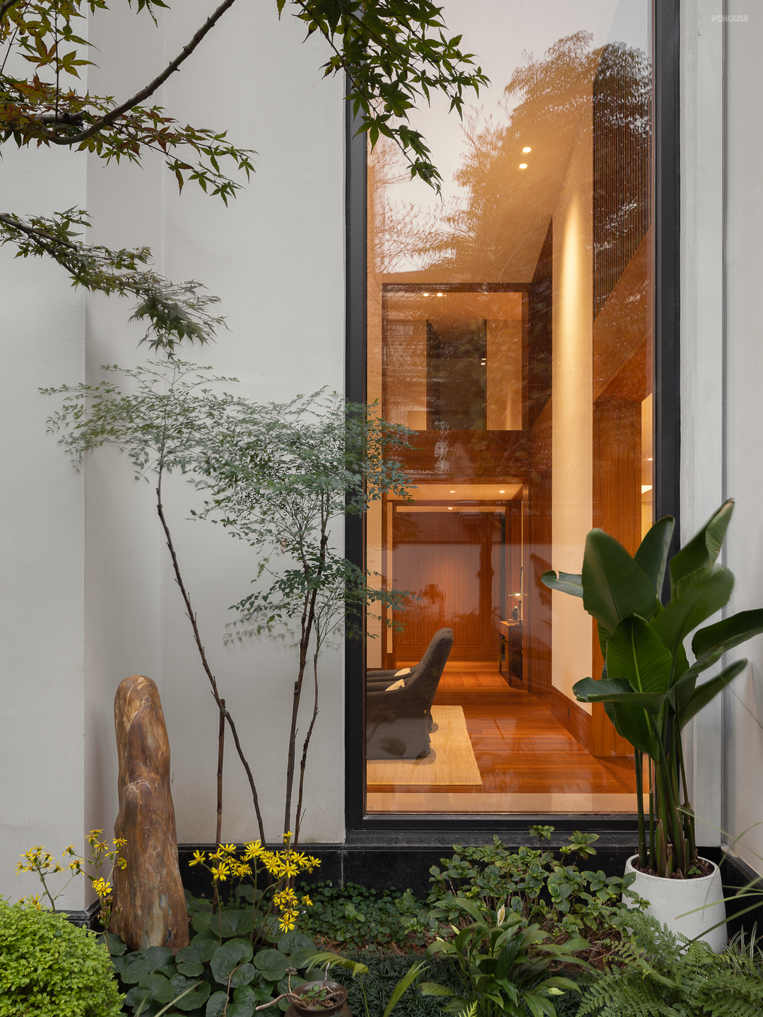 目光随走廊蔓延至尽头,定格每一处窄窗或门洞,一眼望见院落的生机,如室内镶嵌的自然端景,构成多元的情境感知,赋予无限意趣。