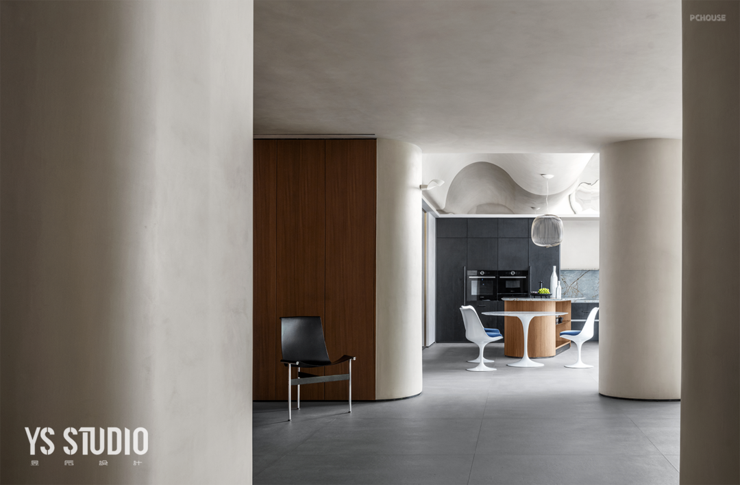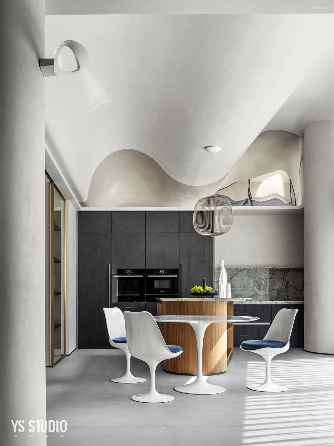 早餐区顶面的波浪曲线吊顶与中厨相联结,这是隐藏各类管道的巧心,也为室内形成了独特的风景线,迎接光线的柔和过渡。这个区域属东南方,日照最充足的地方。我们期望这个家是遵循着自然规律,以光作为闹钟,日出而食。每日清晨,都是全新的开始。