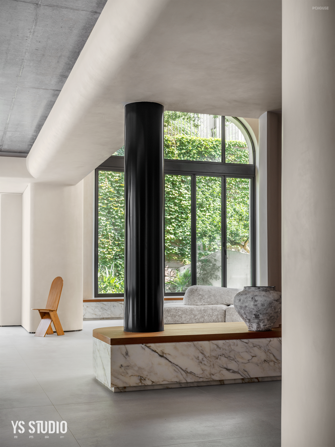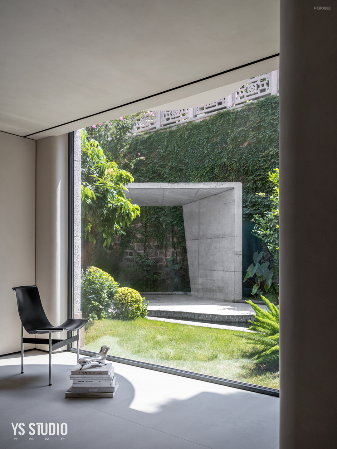 花园的设计来自杨旭的建议,从建筑师斯卡帕设计的威尼斯斯坦帕利亚基金会获得灵感,斯卡帕的设计理念是利用空间隔离产生的视错觉,塑造空间的诗意。杨旭参照他的手法,在户外设置了水池,借由水的隔绝,拉开了院墙与观者的距离,再以错落的绿色植物覆盖远处的围墙,水光绿影,扩展了院落的空间感。”