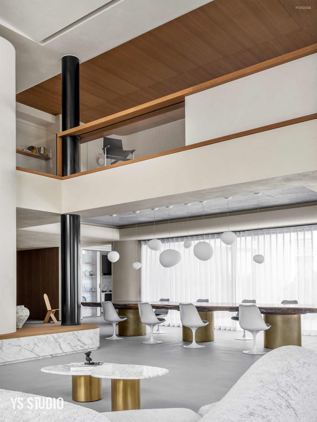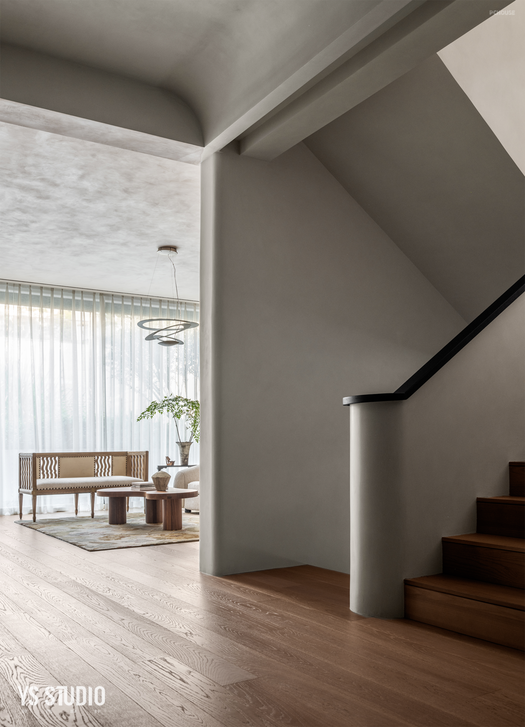 黑色的立柱拉通了一二楼,为空间增加了延伸感。二楼是家人的活动场所,材质的延续也让两层楼的空间多了互动感。除此之外,木质作为一种最贴合大自然的材质,于顶面、于细节中进行点缀,并顺势延伸至每一层楼,同样贯穿于这个家中,与空间气质不谋而合。