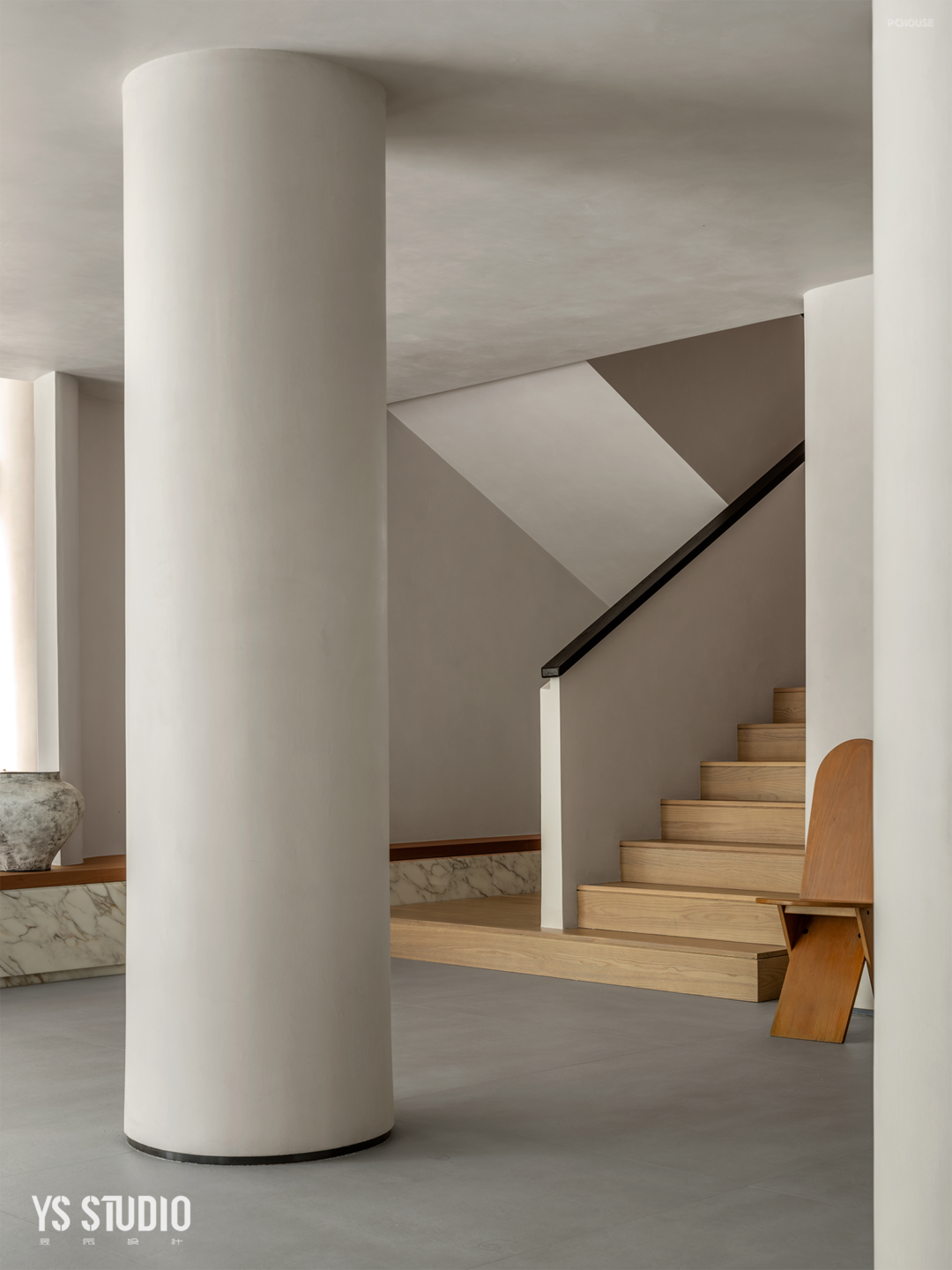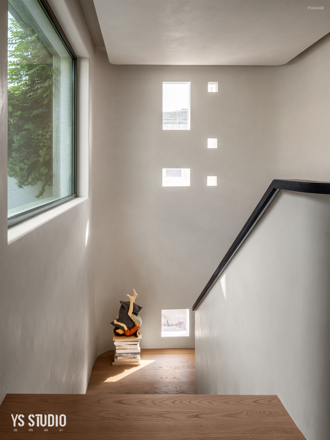 楼梯间的孔洞,经过了特意的设计。几何造型的墙孔让光“趁虚而入”,自由挥洒。每当晴天时,便是最舒展自然的时刻。室内空间因为光的变幻充满呼吸感,融入自然,也构建了人与自然之间和谐共生的关系。