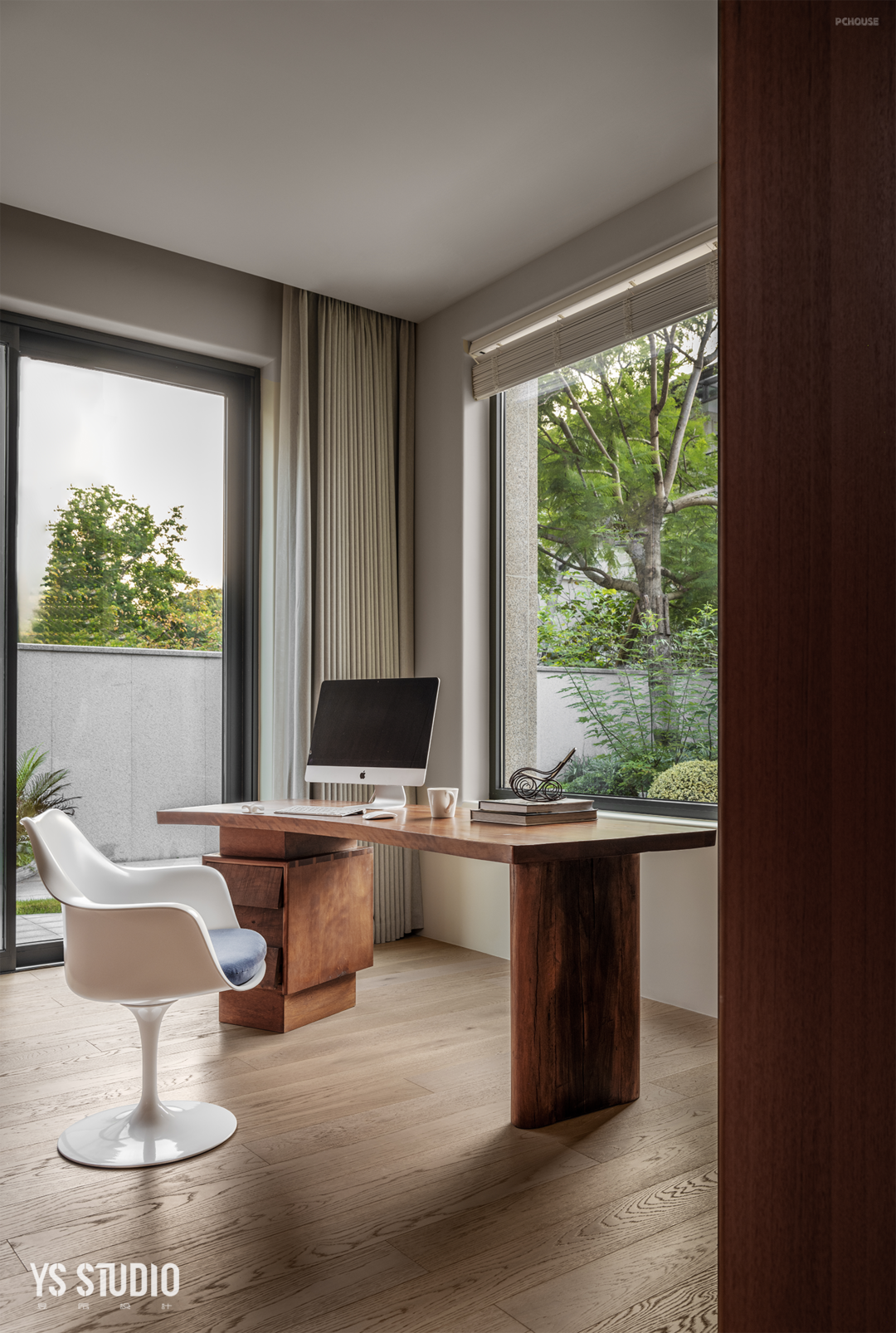 相较于一楼与自然接壤的大空间,二楼更多的是感知静谧、从容。更多的木质元素的运用让空间的温度变得更适宜身体本身。