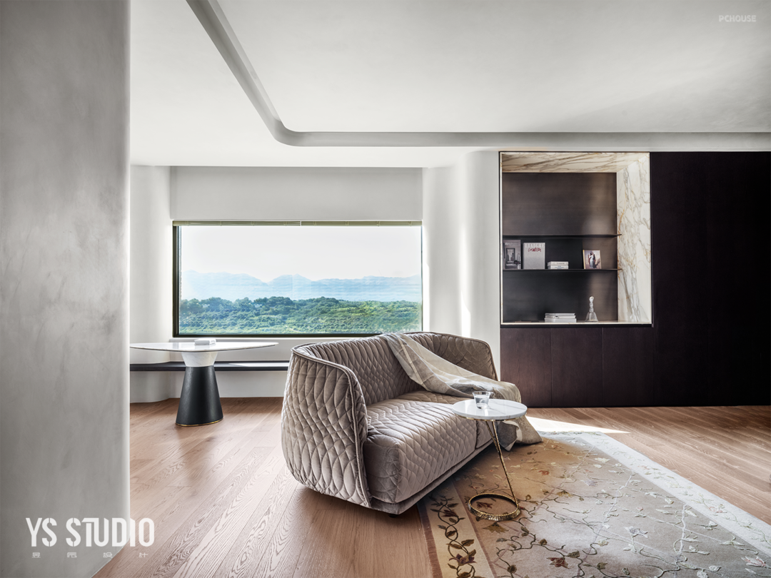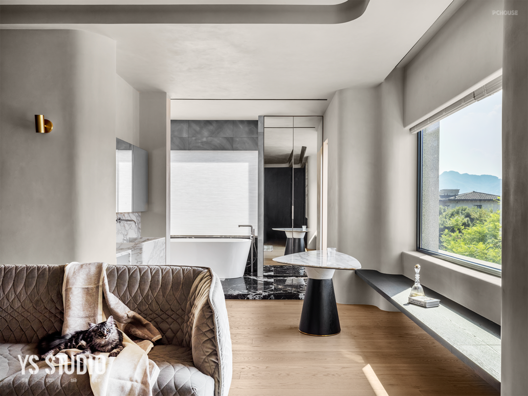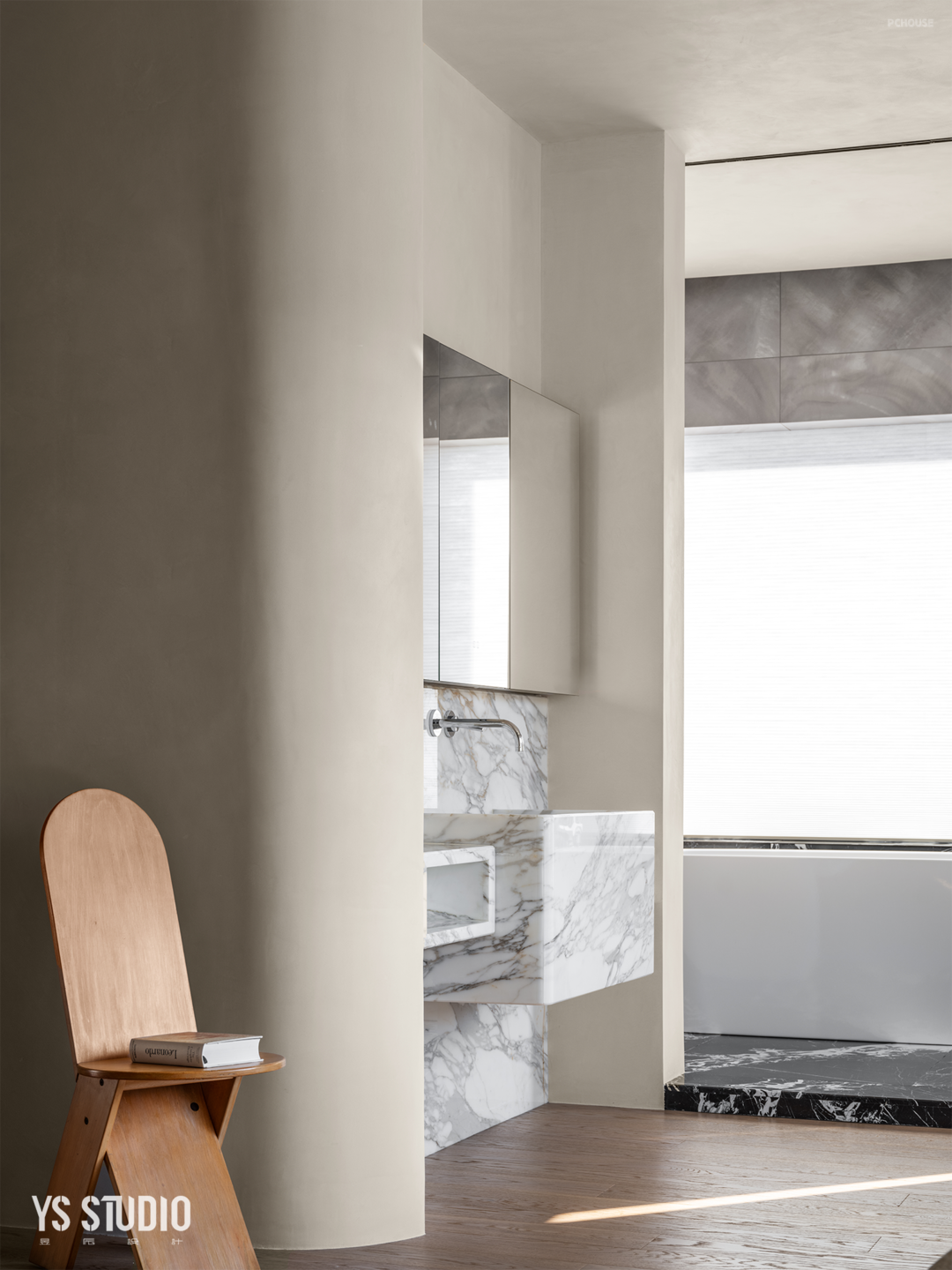 衣帽间、卧室,更关注居住者精神、意识、感觉、身体等。不同的颜色表现着不同的性格特征,我们在此处增加了深邃的用色,它是屋主潜意识里坚韧的一面。看过山川险阻、辽阔炙热,回归到安宁。雅致的配色与窗边自然的景致,会冲淡一切情绪,给予屋主包容。