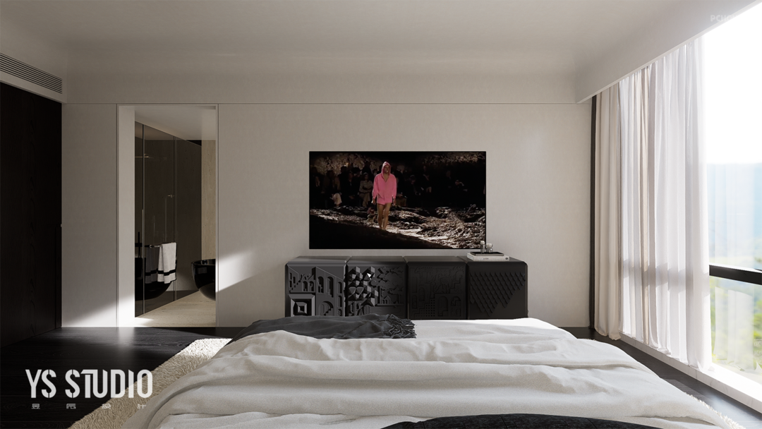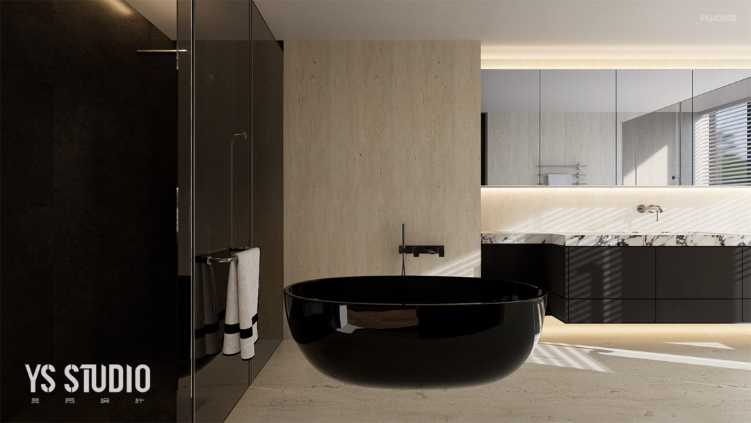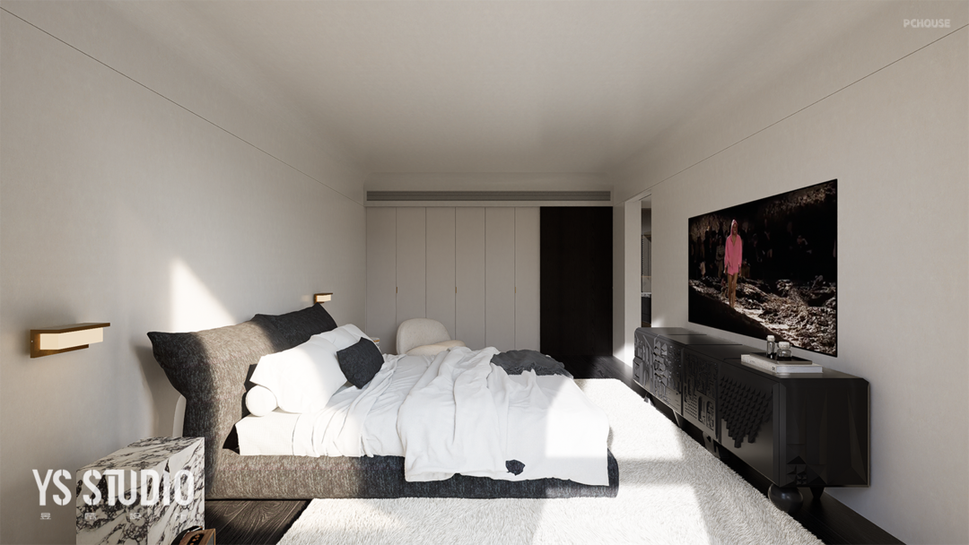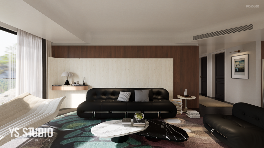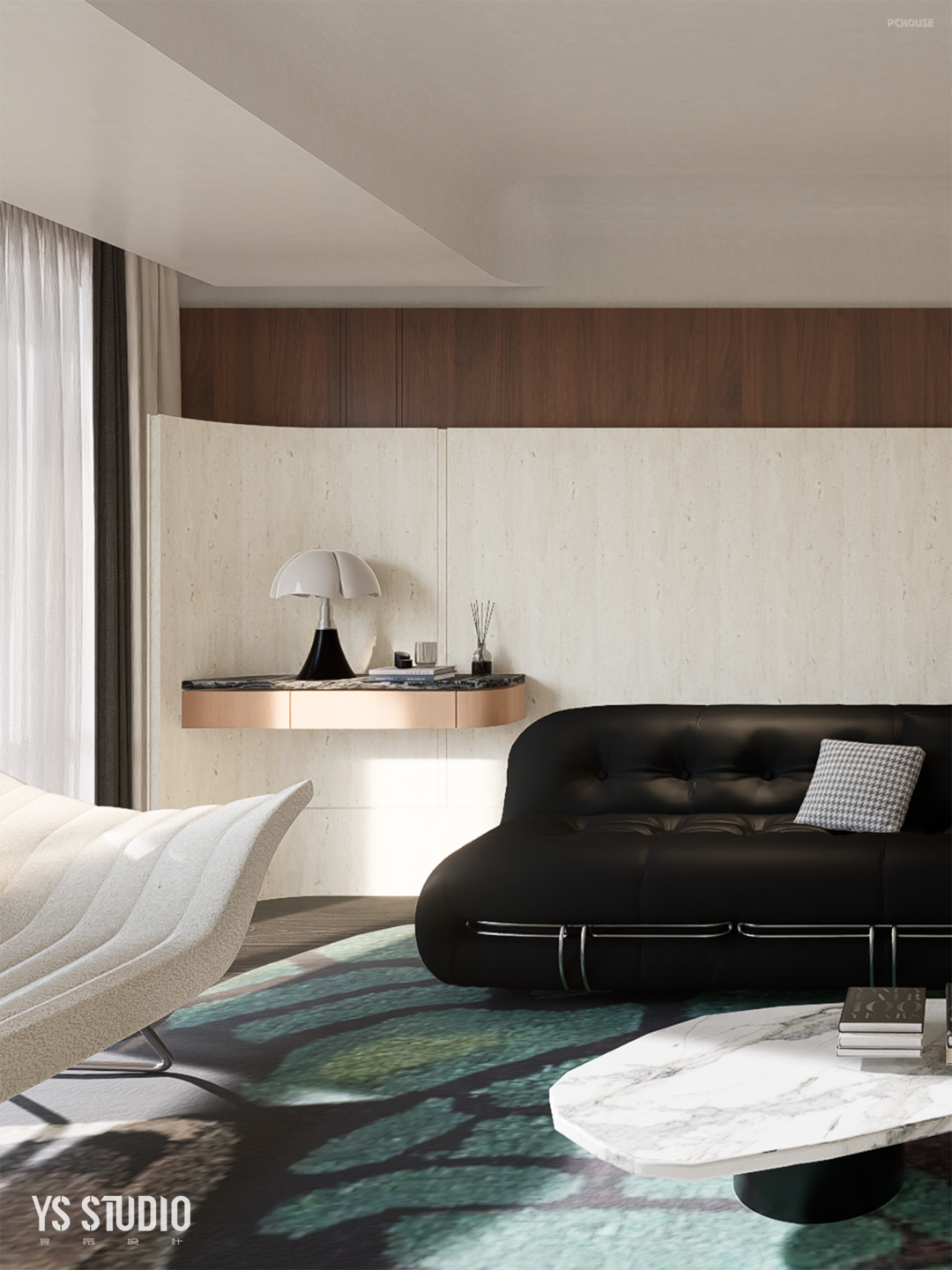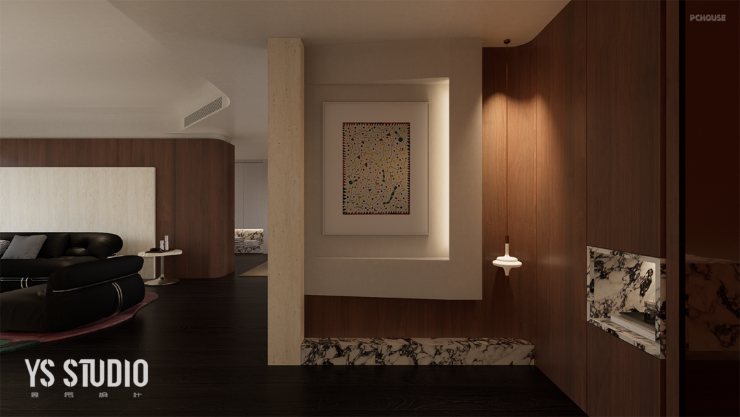 客厅更在意的是自我的使用、需求,而并非单纯待客。因此设计的重点是角落的打造,同样以木质和洞石进行拼接、转弧作底,于沙发旁生出了自然的悬挂台。金色的跳跃给空间带来了少许艺术的重量。