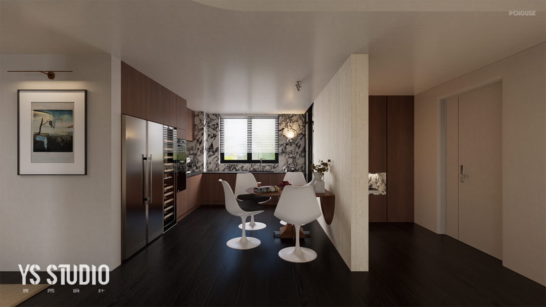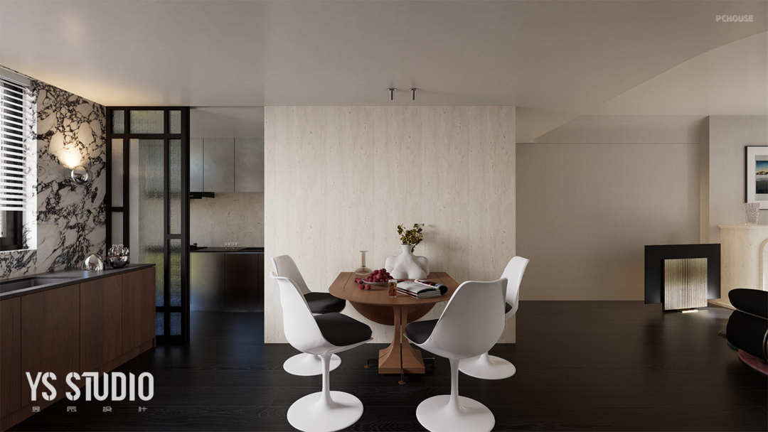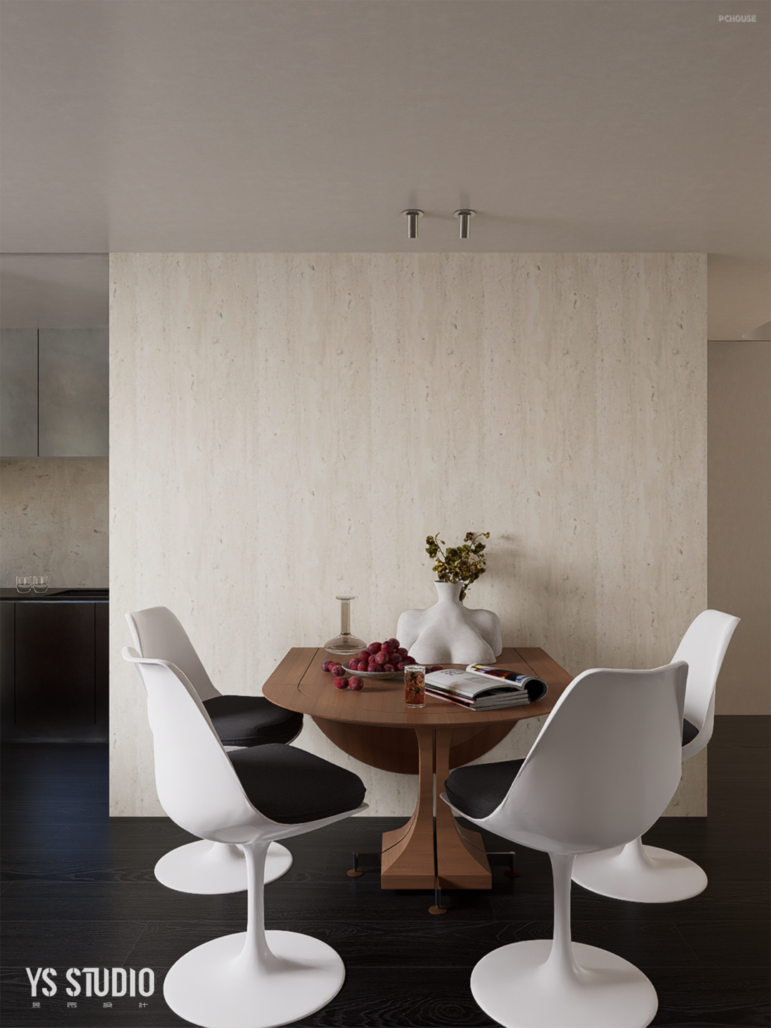 屋主是一位对生活方式有所追求的女性,她是重庆小曼谷-紫薇路一家网红云南菜的老板,这家店于2023年有着非常惊人的拓展,因此她对美式、品茗、红酒、茶道等多个领域都有一定的研究。同时,她也拥有对时尚的灵敏度,多年国外的生活足以使其捕捉到独属于自己空间的质感。我们用设计作为语言,去表达、传递、完善这一份对生活的热爱,同时又与复古的质感有所关联。空间通透明亮、布局合理,在极简质感的现代设计里又裹挟了岁月的痕迹,酿成空间里的精致和复古气。