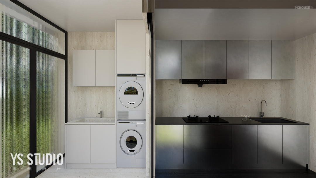 拉上折叠门,便是独立的中厨和洗衣房。这个空间以简约为主,用色克制,不锈钢和洞石两种材质的混搭使用呼应了自然随性的主题。