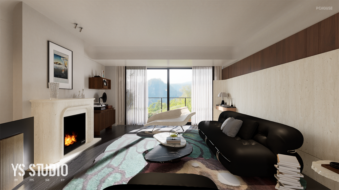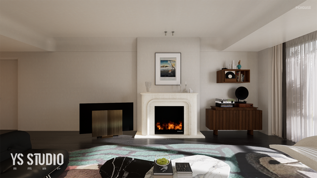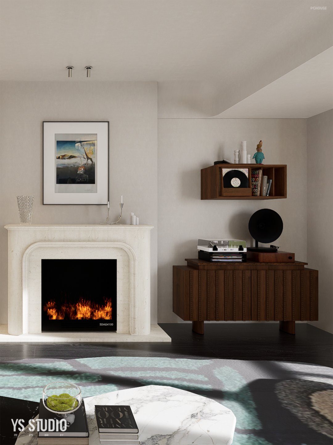 洞石制成的壁炉代替了传统电视墙,给了空间历史感。撞色的地毯、撞色的茶几、木质柜体、老式唱片机、散落的书籍...... 家是一面镜子,折射出你的喜好和生活习惯,诉说着你是个怎么样的个体。