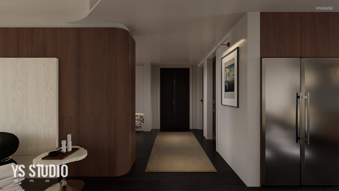 弧形元素使过道显得更为宽阔,也让客餐厅、书房拥有了更流畅的生活动线。地毯的铺设,让家的“交通枢纽”更具仪式感。